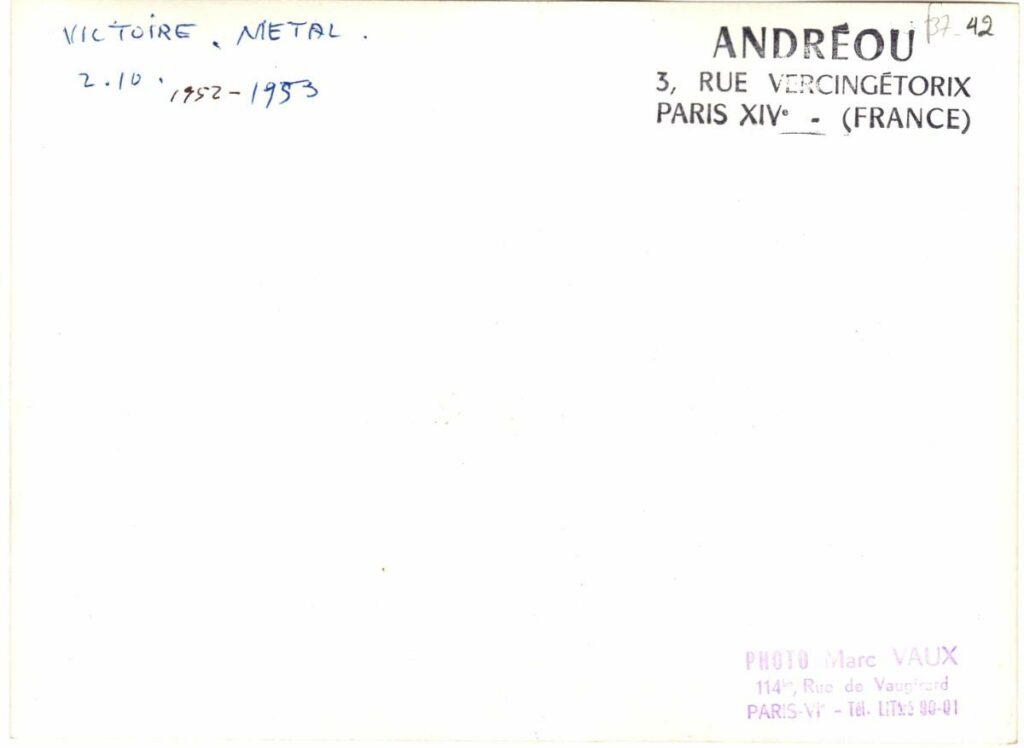 Black-and-white printed photograph of an artwork by the sculptor Kostas Andreou, with a handwritten inscription and artist’s stamp on the reverse side.