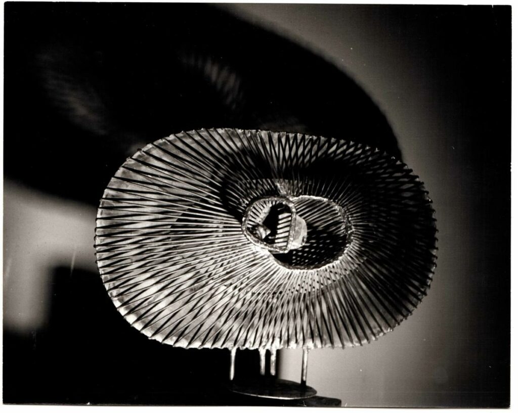 Black-and-white printed photograph of an artwork by the sculptor Kostas Andreou, with a handwritten inscription and artist’s stamp on the reverse side.