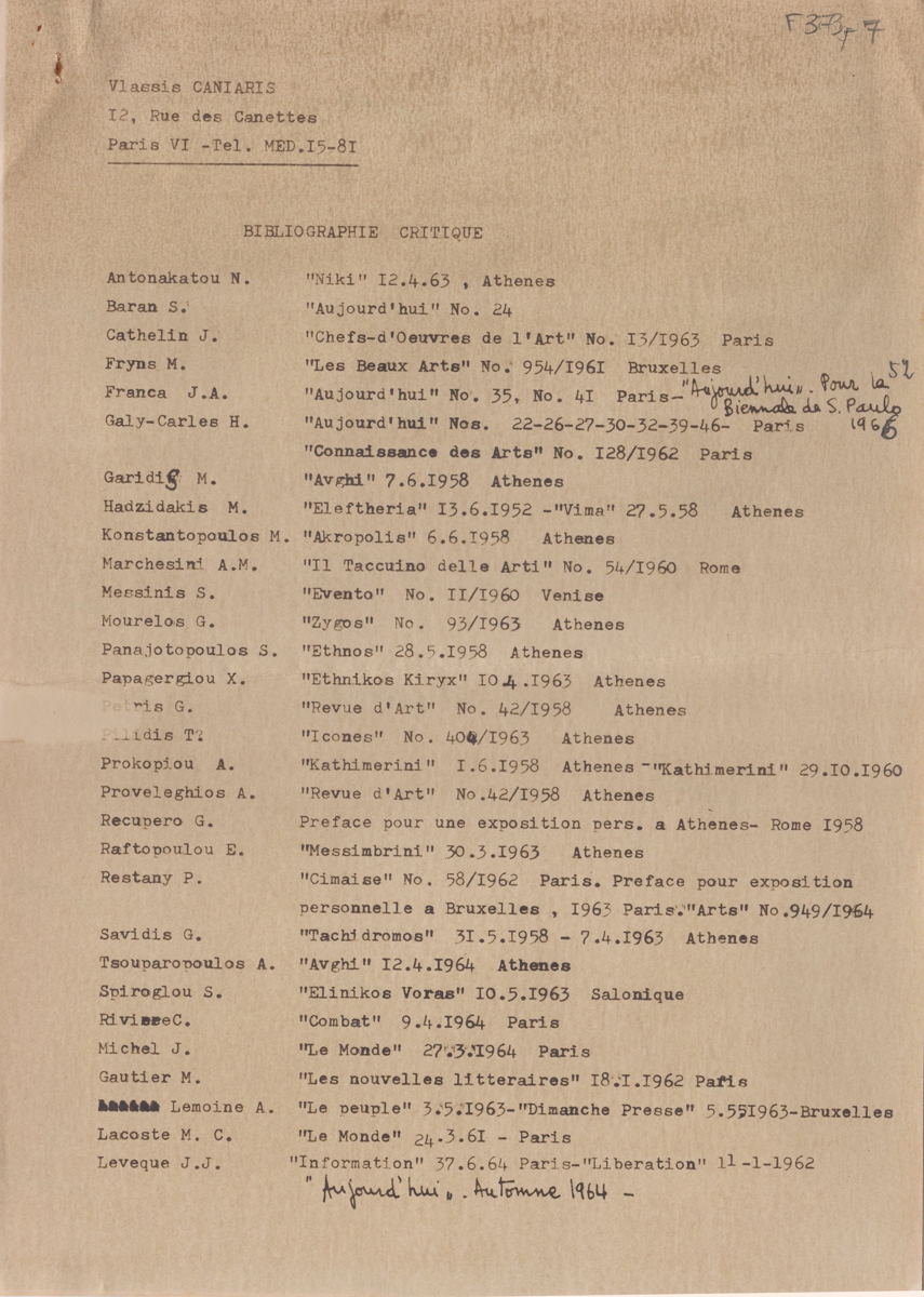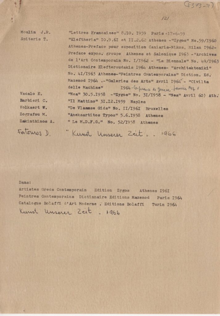Spiteris Tonis (1910 - 1986) ; Katraki Vaso (1914 - 1988) ; Spiteri-Veropoulou Ioanna (1920 - 2000) ; José Pierre ; Michalis Katzourakis ; Fassianos Alekos (1935 - 2022) ; Simossi Gabriela (1926 - 1999) ; Tsoclis Costas (1930) ; Opy Zouni (1941 - 2008) ; Gaitis Yannis (1923 - 1984) ; Mytaras Dimitris (1934 - 2017) ; Karas Christos (1930 - 2023) ; Denis Schneider ; Vernadaki Eleni (1933) ; Takis (Vassilakis Panayiotis) (1925 - 2019) ; Sperantzas Vassilis (1938) ; Alexis Akrithakis (1939 - 1994) ; Achilleas Droungas (1940) ; Theofylaktopoulos Makis (1939 - 2023) ; Kaniaris Vlassis (1928 - 2011) ; Karavouzis Sarantis (1938 - 2011) ; Θεόδωρος Μανωλίδης (1940)