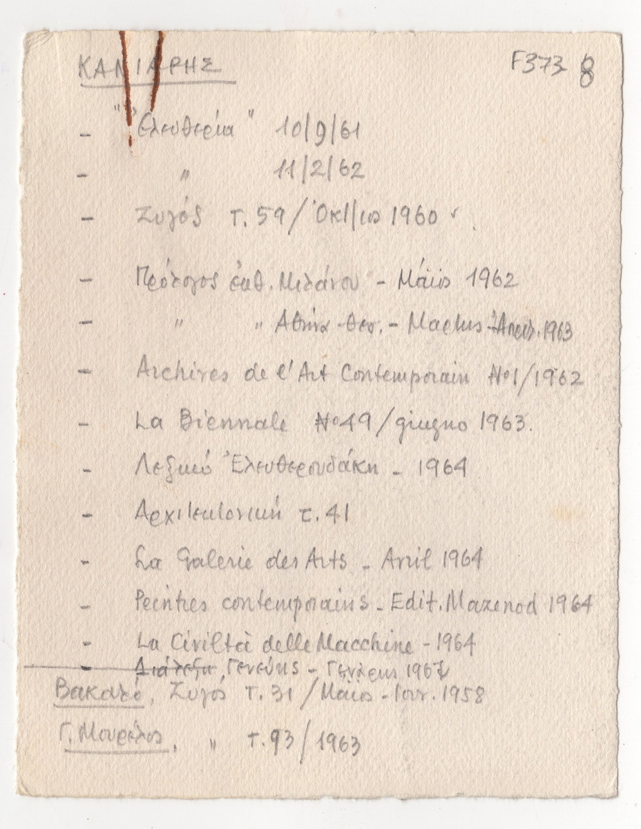 Spiteris Tonis (1910 - 1986) ; Katraki Vaso (1914 - 1988) ; Spiteri-Veropoulou Ioanna (1920 - 2000) ; José Pierre ; Michalis Katzourakis ; Fassianos Alekos (1935 - 2022) ; Simossi Gabriela (1926 - 1999) ; Tsoclis Costas (1930) ; Opy Zouni (1941 - 2008) ; Gaitis Yannis (1923 - 1984) ; Mytaras Dimitris (1934 - 2017) ; Karas Christos (1930 - 2023) ; Denis Schneider ; Vernadaki Eleni (1933) ; Takis (Vassilakis Panayiotis) (1925 - 2019) ; Sperantzas Vassilis (1938) ; Alexis Akrithakis (1939 - 1994) ; Achilleas Droungas (1940) ; Theofylaktopoulos Makis (1939 - 2023) ; Kaniaris Vlassis (1928 - 2011) ; Karavouzis Sarantis (1938 - 2011) ; Θεόδωρος Μανωλίδης (1940)
