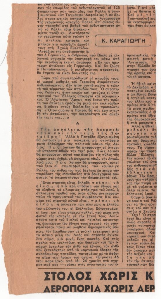 A newspaper clipping, dated October 27, 1946, featuring an article by Orestis Kanellis about the sculptor Christos Kapralos.