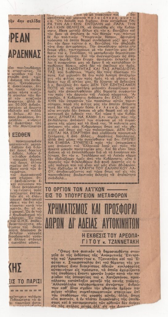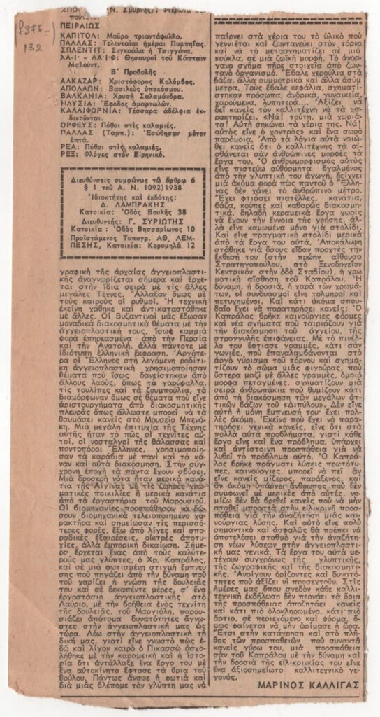 A clipping from the newspaper “To Vima”, dated November 4, 1950, featuring an article by Marinos Kalligas to the art of ceramics through time and criticism of the ceramics exhibition by Christos Kapralos in Athens.