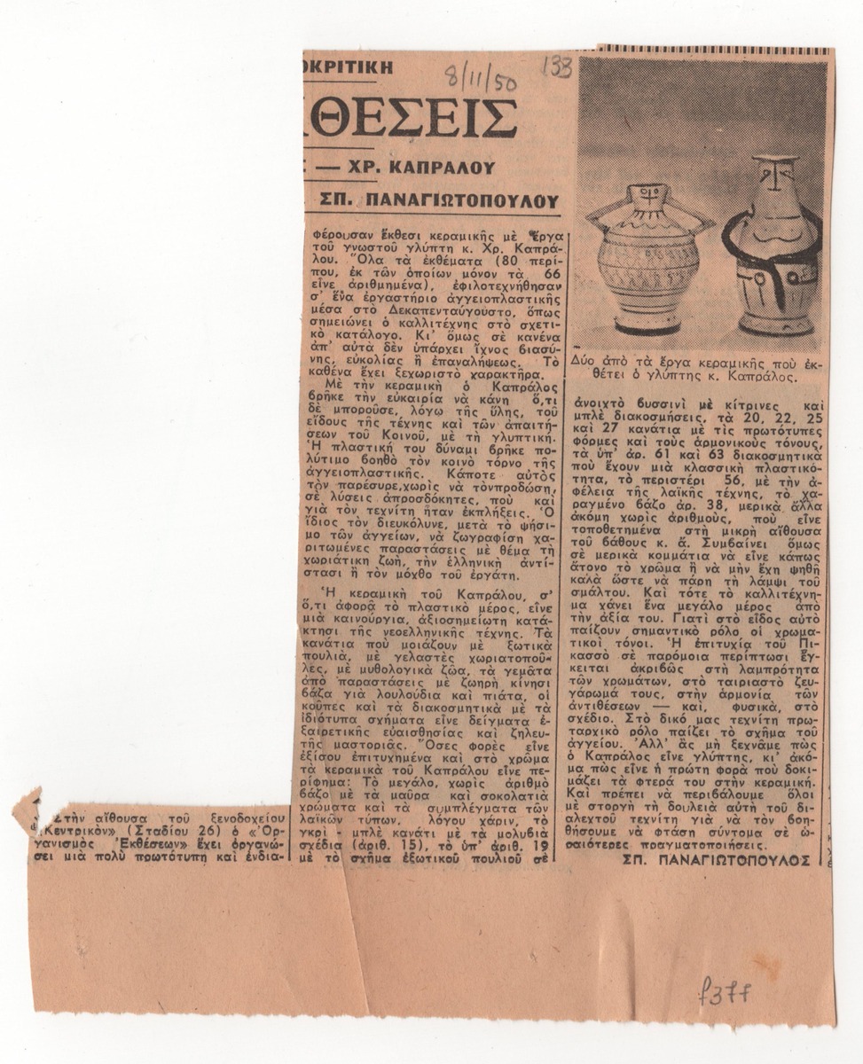 A newspaper clipping, dated November 8, 1950, featuring a review by Sp. Panagiotopoulos for the solo exhibition of ceramics by Christos Kapralos in Athens.