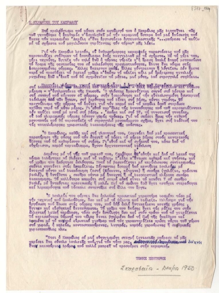 Typewritten text featuring a review of an exhibition (?) of ceramics by Christos Kapralos by Tonis Spiteris.