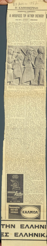 A clipping from the newspaper “I Kathimerini”, dated May 22, 1957, featuring an article by Angelos Prokopios about exhibitions of the period.