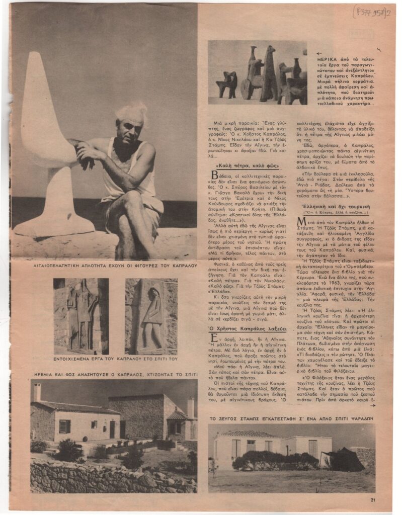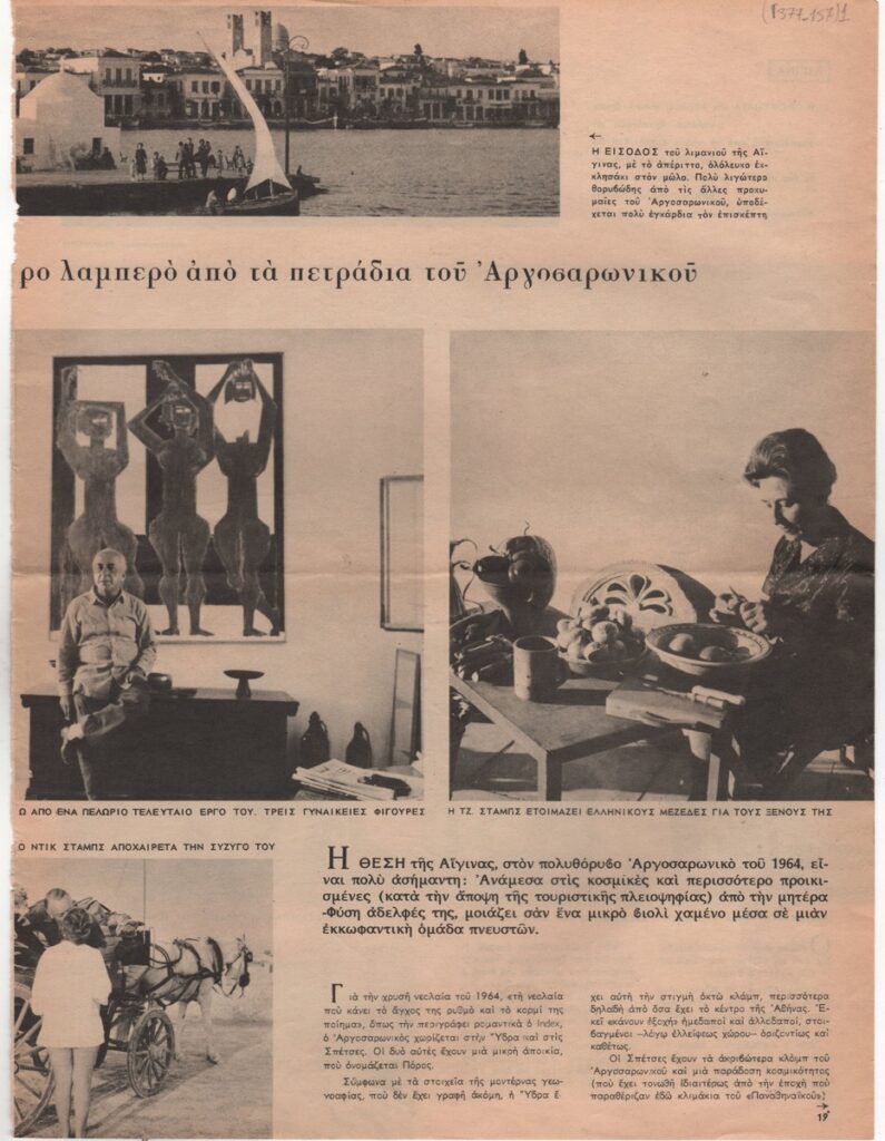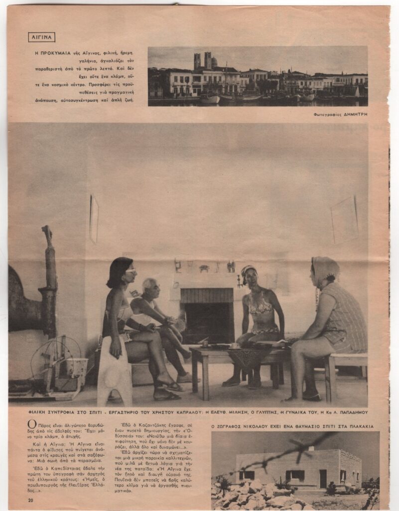 A clipping from the magazine “Eikones”, dated August 28, 1964,, featuring a photographic report by Freddy Germanos about life and artistic creation on the island of Aegina.