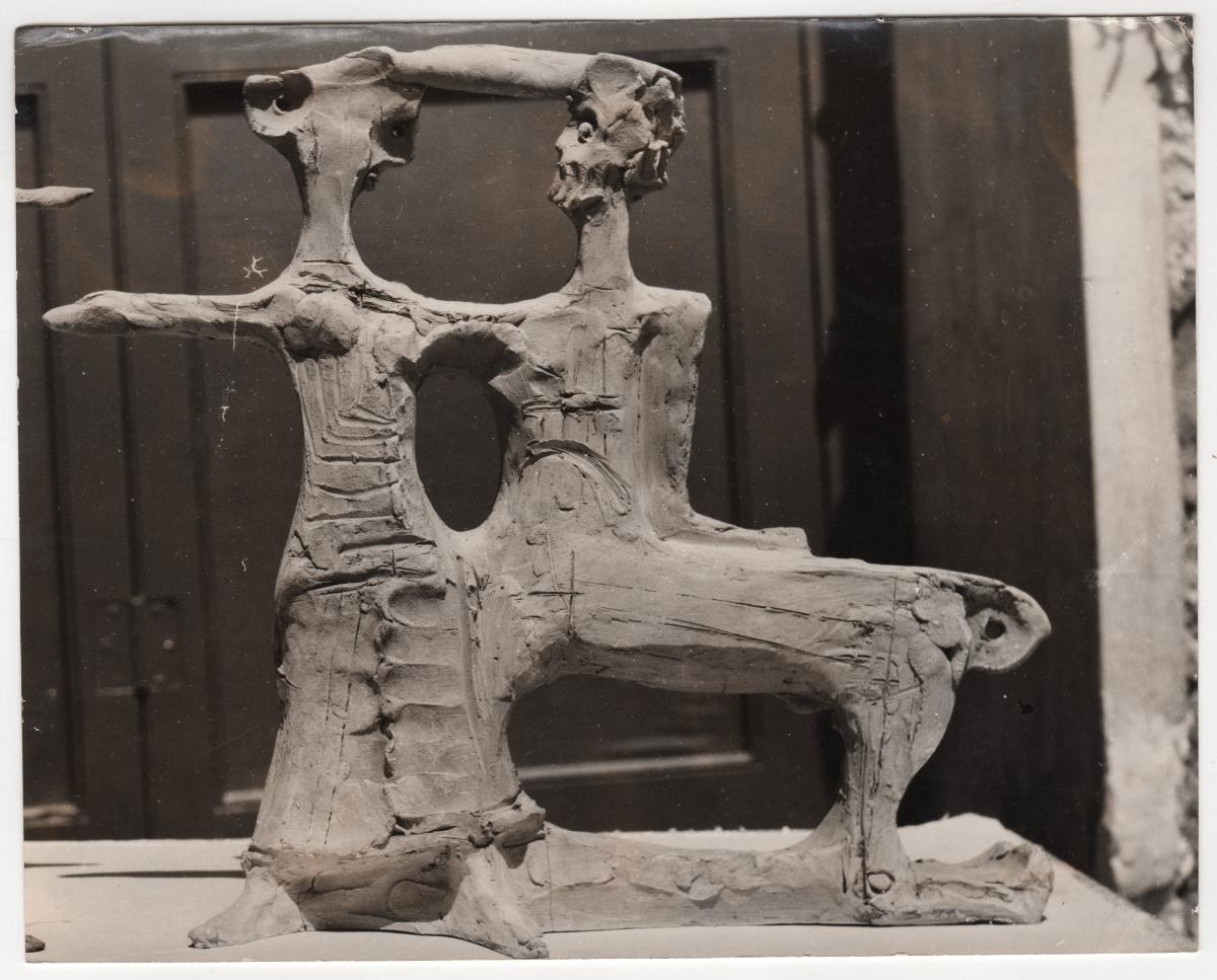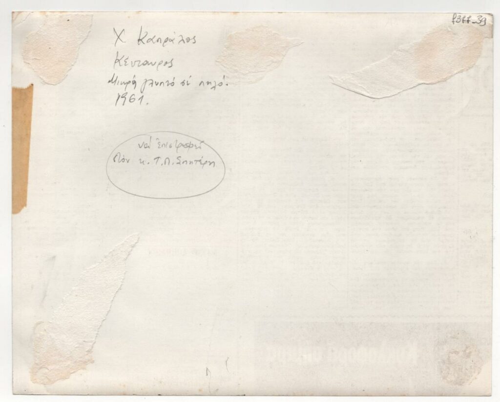 Black-and-white printed photograph of an artwork by Christos Kapralos. On the reverse, inscription.