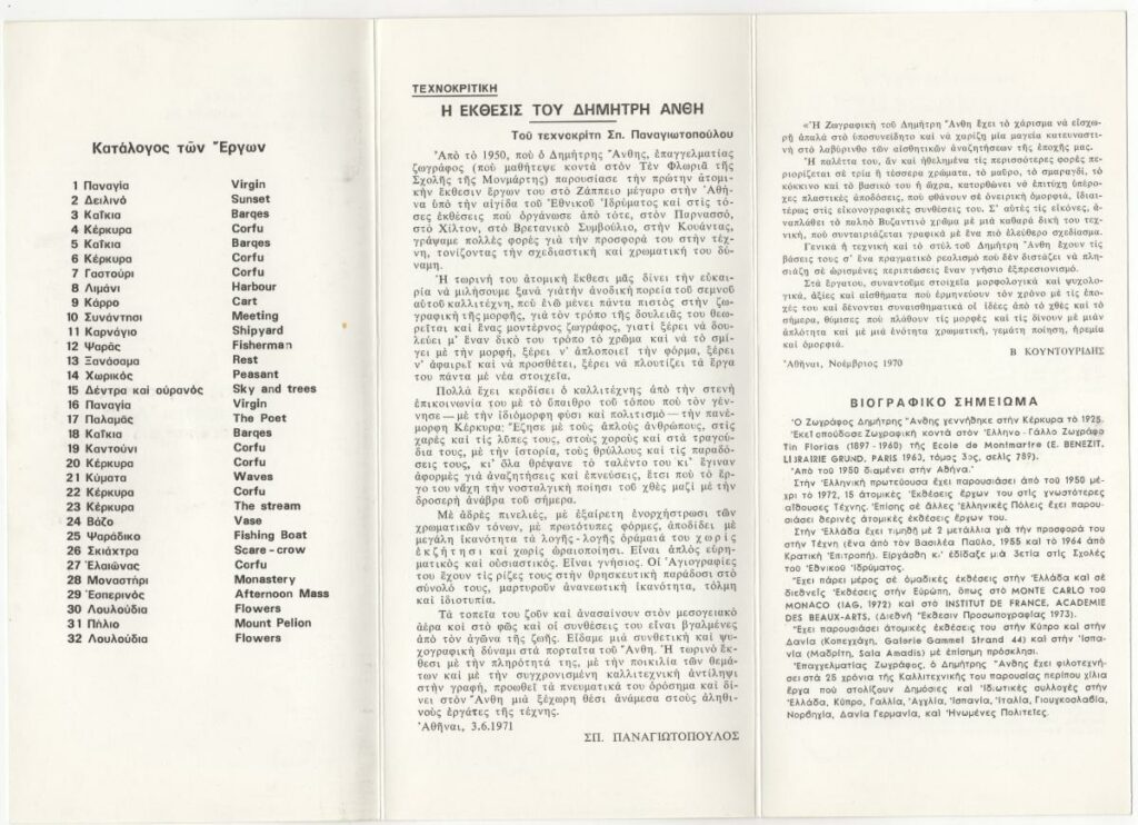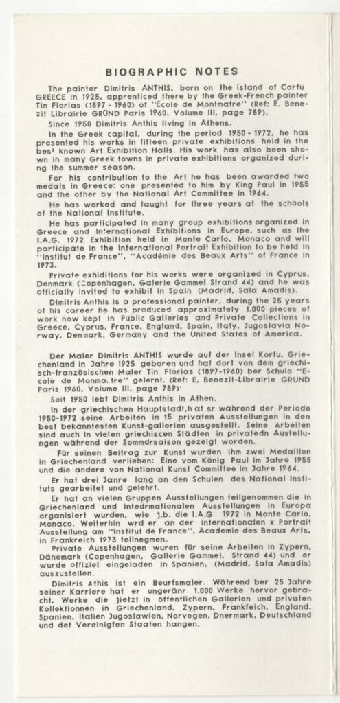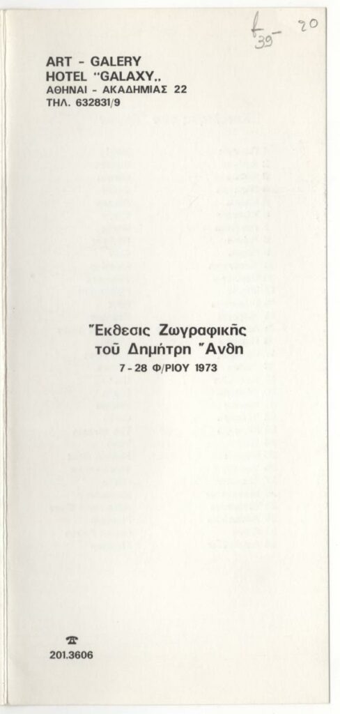 Pamphlet of Dimitris Anthi’s solo exhibition at the Art Galery of the Hotel Galaxy in Athens. It contains list of works, review by Sp. Panagiotopoulos and V. Kountouridis and artist biographical note in four languages.