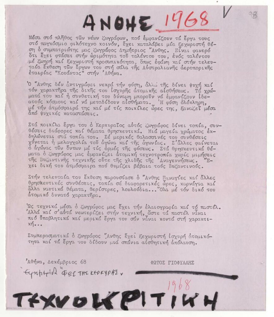 Typescript transcription of a review by Fotos Giofyllis for Dimitris Anthi’s solo exhibition in Athens.