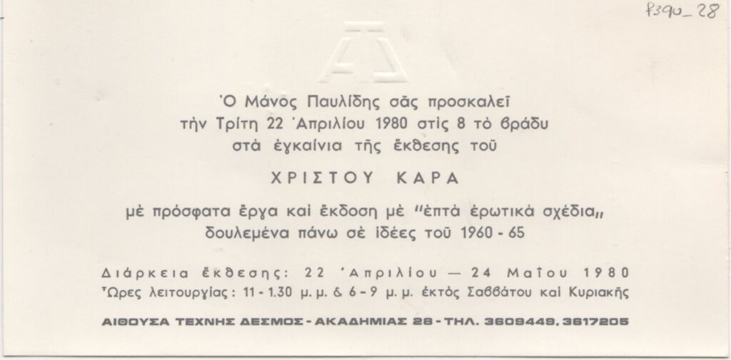 Spiteris Tonis (1910 - 1986) ; Katraki Vaso (1914 - 1988) ; Spiteri-Veropoulou Ioanna (1920 - 2000) ; José Pierre ; Michalis Katzourakis ; Fassianos Alekos (1935 - 2022) ; Simossi Gabriela (1926 - 1999) ; Tsoclis Costas (1930) ; Opy Zouni (1941 - 2008) ; Gaitis Yannis (1923 - 1984) ; Mytaras Dimitris (1934 - 2017) ; Karas Christos (1930 - 2023) ; Denis Schneider ; Vernadaki Eleni (1933) ; Takis (Vassilakis Panayiotis) (1925 - 2019) ; Sperantzas Vassilis (1938) ; Alexis Akrithakis (1939 - 1994) ; Achilleas Droungas (1940) ; Theofylaktopoulos Makis (1939 - 2023) ; Kaniaris Vlassis (1928 - 2011) ; Karavouzis Sarantis (1938 - 2011) ; Θεόδωρος Μανωλίδης (1940)