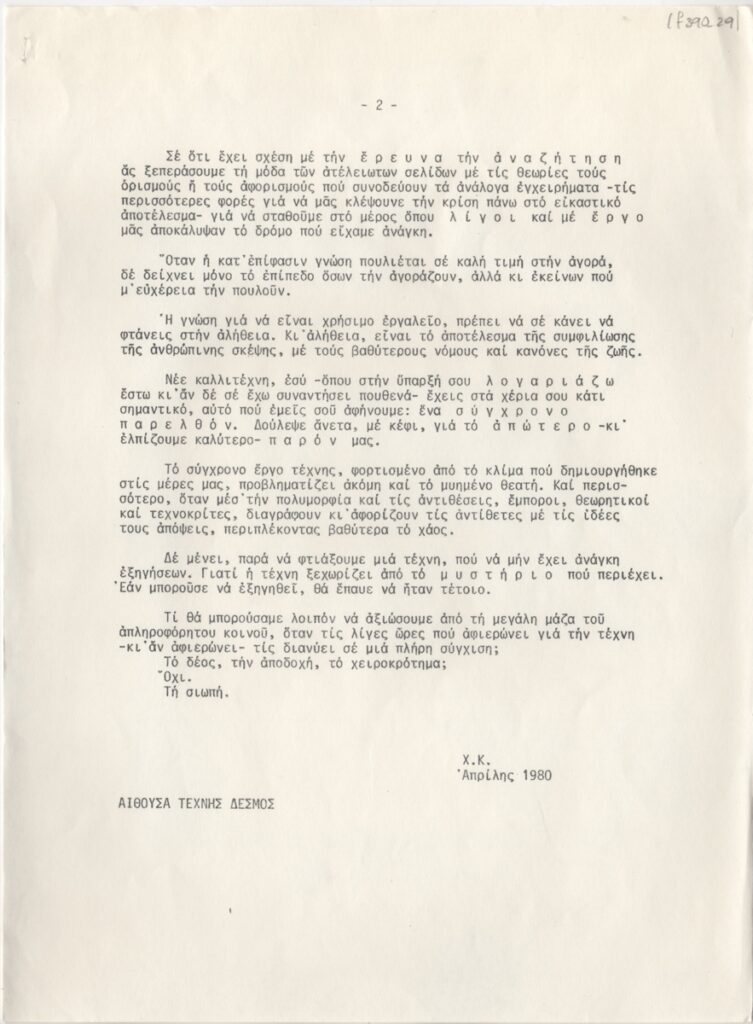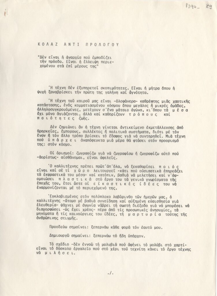 Spiteris Tonis (1910 - 1986) ; Katraki Vaso (1914 - 1988) ; Spiteri-Veropoulou Ioanna (1920 - 2000) ; José Pierre ; Michalis Katzourakis ; Fassianos Alekos (1935 - 2022) ; Simossi Gabriela (1926 - 1999) ; Tsoclis Costas (1930) ; Opy Zouni (1941 - 2008) ; Gaitis Yannis (1923 - 1984) ; Mytaras Dimitris (1934 - 2017) ; Karas Christos (1930 - 2023) ; Denis Schneider ; Vernadaki Eleni (1933) ; Takis (Vassilakis Panayiotis) (1925 - 2019) ; Sperantzas Vassilis (1938) ; Alexis Akrithakis (1939 - 1994) ; Achilleas Droungas (1940) ; Theofylaktopoulos Makis (1939 - 2023) ; Kaniaris Vlassis (1928 - 2011) ; Karavouzis Sarantis (1938 - 2011) ; Θεόδωρος Μανωλίδης (1940)