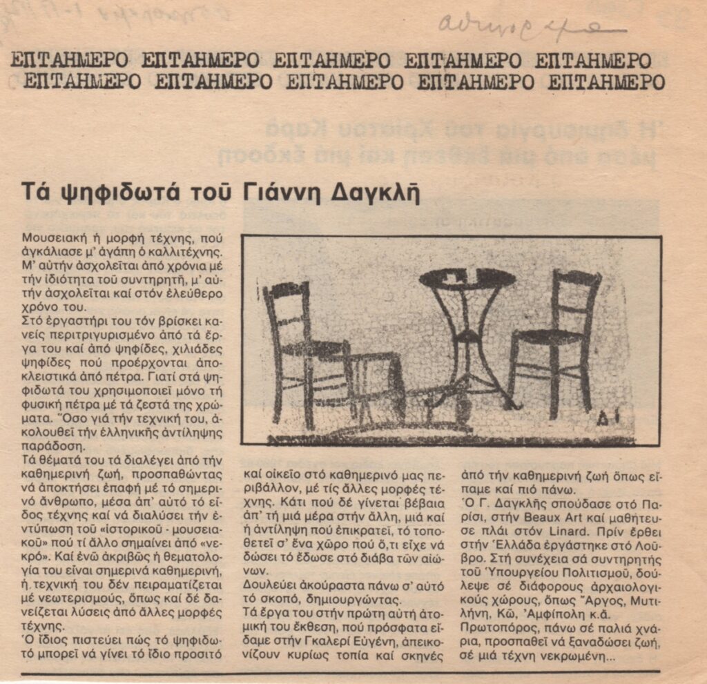 Spiteris Tonis (1910 - 1986) ; Katraki Vaso (1914 - 1988) ; Spiteri-Veropoulou Ioanna (1920 - 2000) ; José Pierre ; Michalis Katzourakis ; Fassianos Alekos (1935 - 2022) ; Simossi Gabriela (1926 - 1999) ; Tsoclis Costas (1930) ; Zouni Opy (1941 - 2008) ; Gaitis Yannis (1923 - 1984) ; Mytaras Dimitris (1934 - 2017) ; Karas Christos (1930 - 2023) ; Denis Schneider ; Vernadaki Eleni (1933) ; Takis (Vassilakis Panayiotis) (1925 - 2019) ; Sperantzas Vassilis (1938) ; Akrithakis Alexis (1939 - 1994) ; Droungas Achilleas (1940) ; Theofylaktopoulos Makis (1939 - 2023) ; Kaniaris Vlassis (1928 - 2011) ; Karavouzis Sarantis (1938 - 2011) ; Θεόδωρος Μανωλίδης (1940)