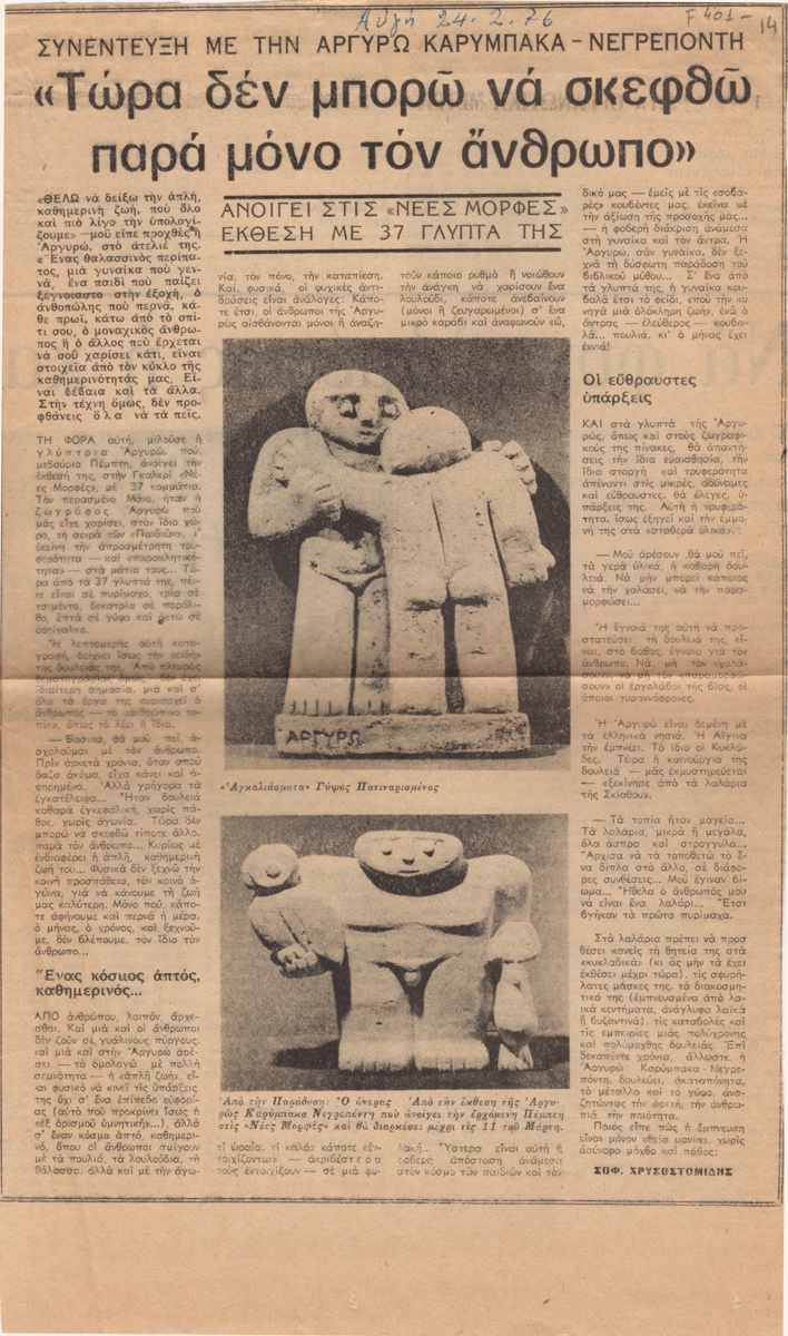 Andreou Kostas (1917 - 2007) ; Kyriakos Rokos (1945) ; Μαρία Λάμπρου ; Luciano Minguzzi ; Tsaras Kostas (1928 - 1986) ; Chariati-Sismani Katerina (1911 - 1990) ; Chrysochoidou, Titsa (1906 - 1990) ; Μαρία Δωρίτου ; Ikaris Nikolaos (1920 - 1994) ; Georgios Kalakallas (1938 - 2021) ; Kenneth Mackenzie Clark ; Argyro Karympaka-Negreponti (1929) ; Katapodis, Giorgos (1951) ; Χρυσούλα Αντωνοπούλου ; Ledaki Maria (1932) ; Σταύρος Μπονάτσος (1945) ; Dimitris Papageorgiou (1928 - 2016) ; Λήδα Παπακωνσταντίνου-Hughes (1945) ; Aristides Patsoglou (1941) ; Αμαλία Βαμβάκου (1925 - 2014) ; Giorgos Stathopoulos (1944) ; Domenico Calabrone (1928 - 2000) ; Κώστας Δομπούλας ; Στάθης Κούρτης ; Elvio Becheroni (1934 - 2000) ; Ευάγγελος Μαρκαντώνης ; Berlini ; Μαρία Βασιλάτου (1936) ; Χαράλαμπος Δαραδήμος ; Βασιλική Γρουσοπούλου-Μαρκούση (1938) ; Τάσος Μουζάκης ; Flip ; Gerasimos Kalogiratos (1940) ; Mascharelli ; Σολομής ; Vulanovic