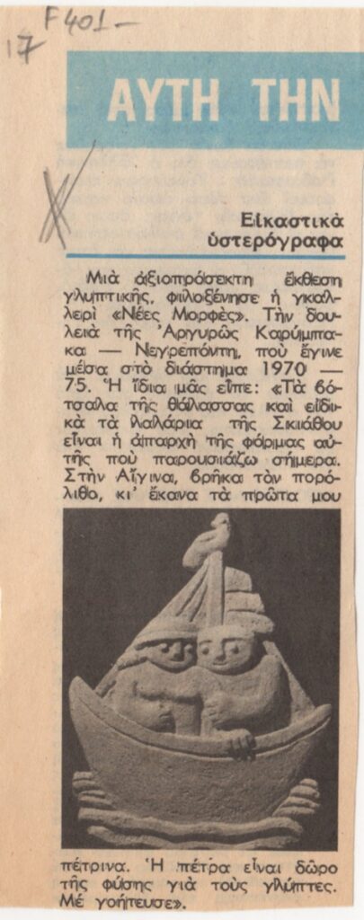 Andreou Kostas (1917 - 2007) ; Kyriakos Rokos (1945) ; Μαρία Λάμπρου ; Luciano Minguzzi ; Tsaras Kostas (1928 - 1986) ; Chariati-Sismani Katerina (1911 - 1990) ; Chrysochoidou, Titsa (1906 - 1990) ; Μαρία Δωρίτου ; Ikaris Nikolaos (1920 - 1994) ; Georgios Kalakallas (1938 - 2021) ; Kenneth Mackenzie Clark ; Argyro Karympaka-Negreponti (1929) ; Katapodis, Giorgos (1951) ; Χρυσούλα Αντωνοπούλου ; Ledaki Maria (1932) ; Σταύρος Μπονάτσος (1945) ; Dimitris Papageorgiou (1928 - 2016) ; Λήδα Παπακωνσταντίνου-Hughes (1945) ; Aristides Patsoglou (1941) ; Αμαλία Βαμβάκου (1925 - 2014) ; Giorgos Stathopoulos (1944) ; Domenico Calabrone (1928 - 2000) ; Κώστας Δομπούλας ; Στάθης Κούρτης ; Elvio Becheroni (1934 - 2000) ; Ευάγγελος Μαρκαντώνης ; Berlini ; Μαρία Βασιλάτου (1936) ; Χαράλαμπος Δαραδήμος ; Βασιλική Γρουσοπούλου-Μαρκούση (1938) ; Τάσος Μουζάκης ; Flip ; Gerasimos Kalogiratos (1940) ; Mascharelli ; Σολομής ; Vulanovic