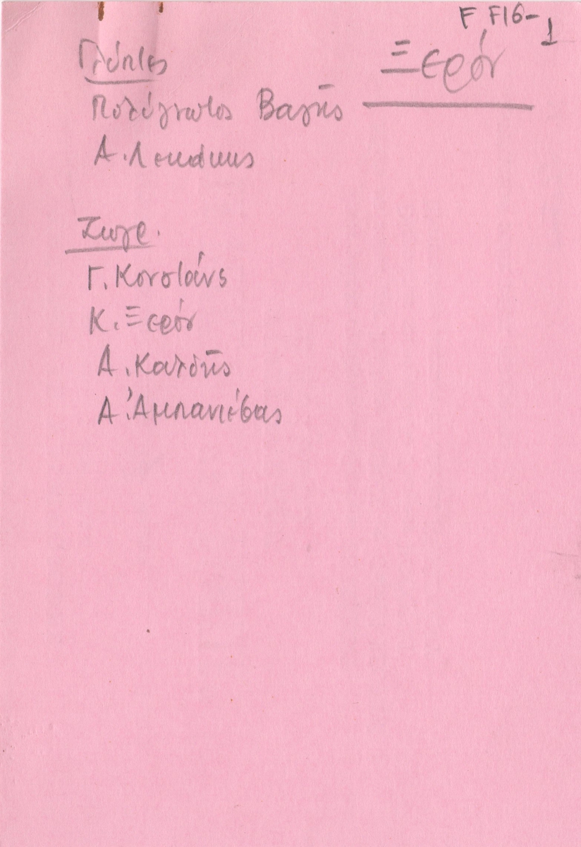 Spiteri-Veropoulou Ioanna (1920 - 2000) ; Andreadi Efi (20th century) ; Mavrommatis Emmanouil (1935) ; Touyas Giorgos (1922 - 1994) ; Sorogas Sotiris (1936) ; Diochanti (1945) ; Μαργαρίτα Λυμπεράκη ; Michalis Katzourakis ; Argyriou Alexandros (1921 - 2009) ; Zongolopoulou Eleni (1909 - 1993) ; Sachinis Nikos (1924 - 1989) ; Simossi Gabriela (1926 - 1999) ; Constantinou Dimitris (1924 - 2010) ; Zouni Opy (1941 - 2008) ; Romanos Chryssa (1931 - 2006) ; (Panagopoulos) Daniel (1924 - 2008) ; Aperghis Achilleas (1909 - 1986) ; Koulentianos Kostas (1918 - 1995) ; Gaitis Yannis (1923 - 1984) ; Georgousopoulos Kostas (1937 - 2024) ; Kalas Nikolas (1907 - 1988) ; Mytaras Dimitris (1934 - 2017) ; Valavanidis Giannis (1939 - 2017) ; Xagoraris Pandelis (1929 - 2000) ; Dekoulakos Ilias (1929 - 1998) ; Karas Christos (1930 - 2023) ; Vernadaki Eleni (1933) ; Takis (Vassilakis Panayiotis) (1925 - 2019) ; Σάββας Κονταράτος ; Manoledaki-Lazaridi Ioanna (1935) ; Philolaos (Tloupas) (1923 - 2010) ; Gravalos Panayiotis (1933 - 2015) ; Droungas Achilleas (1940) ; Iliadis Kostas (1903 - 1991) ; Kanagini Niki (1933 - 2008) ; Kanakakis Lefteris (1934 - 1985) ; Karachalios Kostas (1923 - 2007) ; Kessanlis Nikos (1930 - 2004) ; Kokkinides Demosthenes (1929 - 2020) ; Kontos Dimitris (1931 - 1996) ; Aris Konstantinidis (1913 - 1993) ; Eirini Apergi (1921 - 1994) ; Lazogkas Giorgos (1945 - 2022) ; Logothetis Stathis (1925 - 1997) ; Loucopoulos, Clearchos (1906 - 1995) ; Molfesis Iasson (1925 - 2009) ; Κώστας Αξελός (1924 - 2010) ; Bouteas Yannis (1941 - 2026) ; Nikolaidis Giorgos (1924 - 2001) ; Davou Bia (1932 - 1996) ; Νίκος Φωκάς (1927 - 2021) ; Ρένα Παπασπύρου-Βαρδάκα (1938) ; Pastra Nausica (1921 - 2011) ; Φίλιππος Ηλιού (1931 - 2004) ; Νίκος Γ. Σβορώνος (1911 - 1989) ; Νίκος Χατζηνικολάου, ιστορικός (1938) ; Λίλα Μαραγκού (1938) ; Τίτος Πατρίκιος (1928) ; Χ. Κληρίδη ; Θ. Ρετζής
