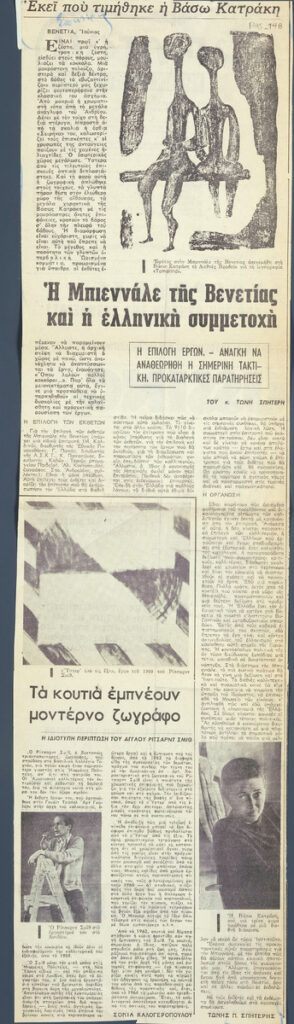 A clipping of the newspaper “Eleftheria”, dated June 26, 1966, featuring an article by Tonis Spiteris on Greek participation in the Venice Biennale, with a particular focus on the recognition of engraver Vasso Katraki and the selection process for exhibitors and the commissioner.