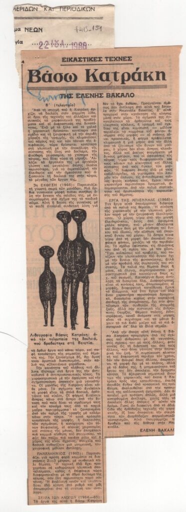 A clipping from the newspaper “Ta Nea”, dated July 22, 1966, featuring an article by Eleni Vakalo on Vasso Katraki’s work in relation to the Venice Biennale lithography prize. It highlights her 1966 solo exhibitions, her participation in the Panhellenic Group Exhibition, the “Horse” series (1964–65), as well as works shown at the Biennale.