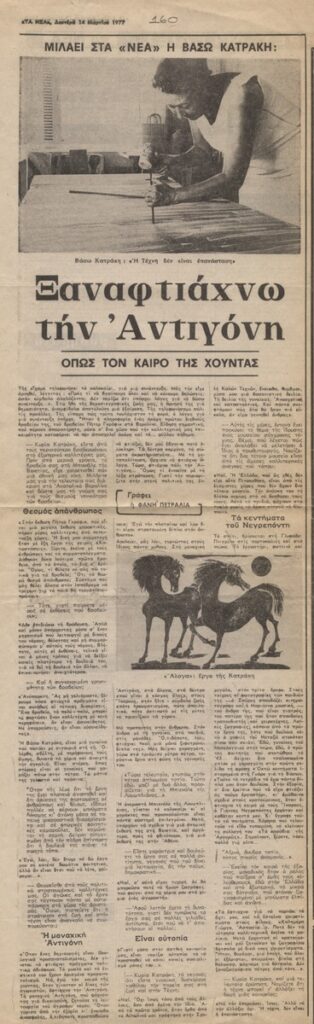 A clipping from the newspaper “Ta Nea”, dated March 14, 1977, featuring an interview with engraver Vasso Katraki about her art, her international awards, and her creations during her period of exile in Gyaros.