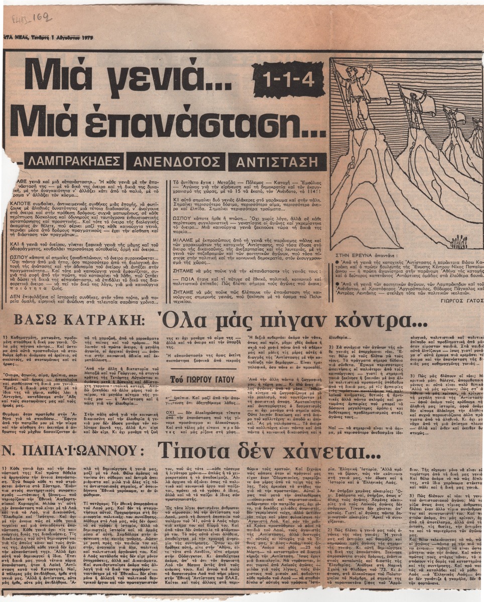 A clipping from the newspaper “Ta Nea”, dated August 1, 1979, featuring Giorgos Gatos’ research on the Generation of 1-1-4, with responses from Vasso Katraki and former Center Union MP Nikos Papaioannou.