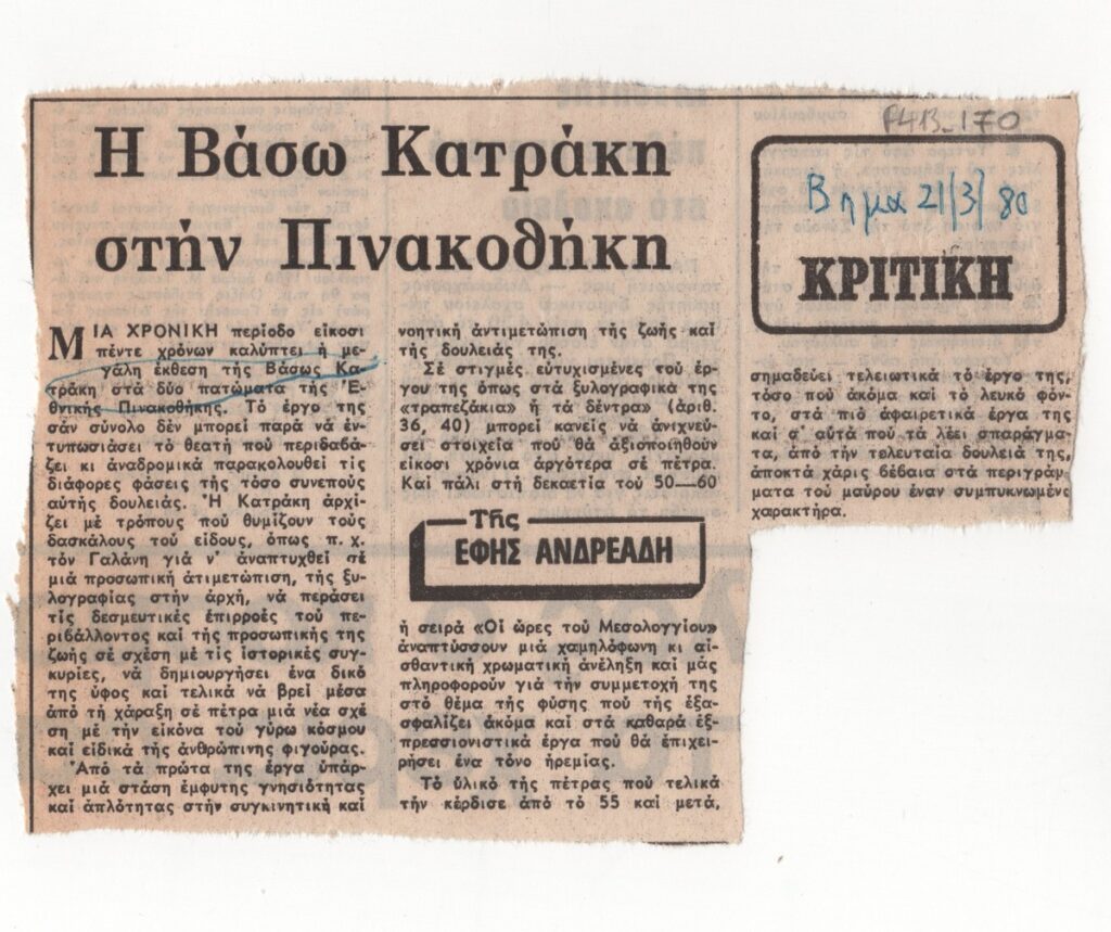 A clipping from the newspaper “To Vima”, dated March 21, 1980, featuring an article about the retrospective exhibition of engraver Vasso Katraki at the National Gallery.