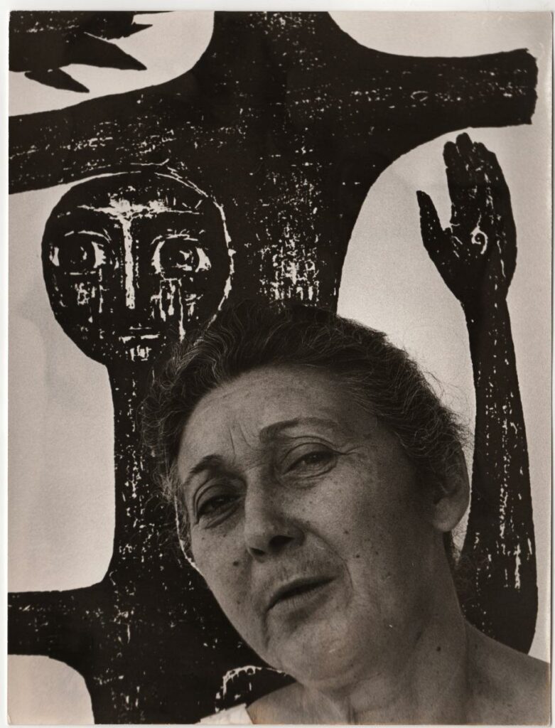 A black-and-white photograph of the engraver Vasso Katraki. On the reverse, publication rights stamp of the newspaper “Ta Nea”