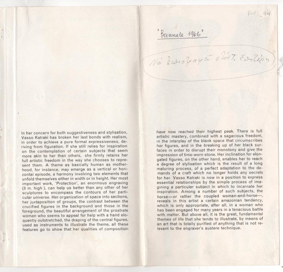 Exhibition Pamphlet clipping. It contains a text by Tonis Spiteris about the work of Vasso Katraki.