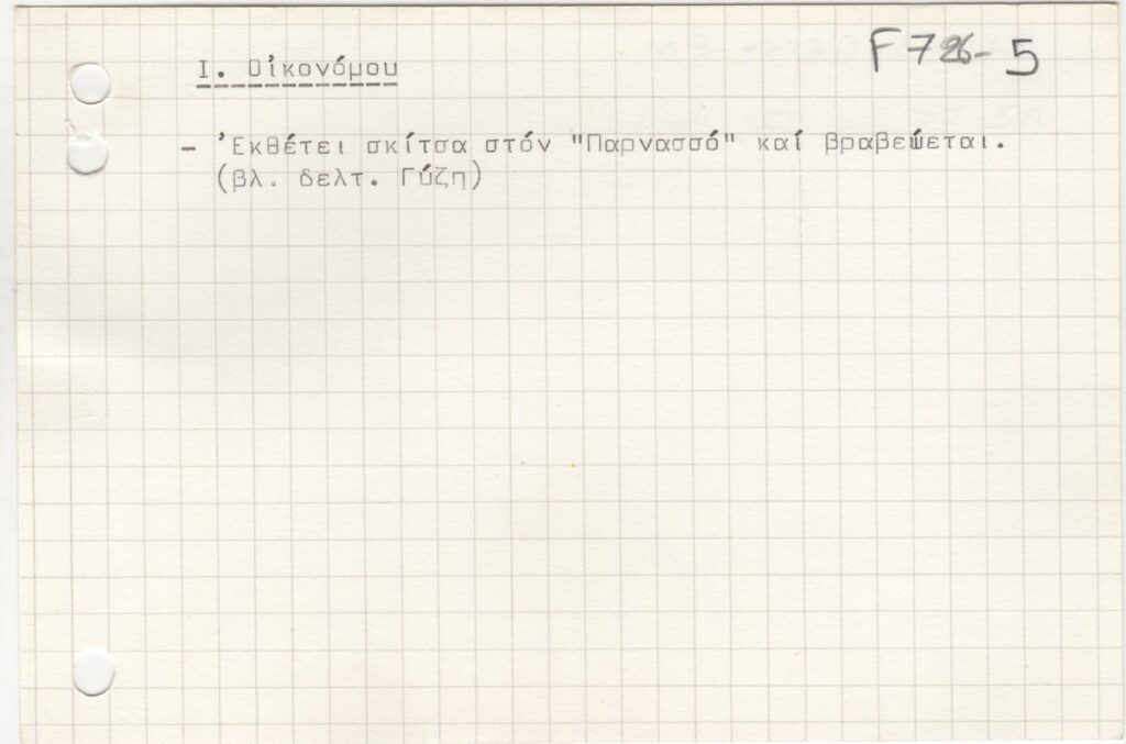 Engonopoulos Nikos (1907 - 1985) ; Gyzis Nikolaos (1842 - 1901) ; Merkouri Melina (1920 - 1994) ; Polymeris Manolis (1951) ; Kazimir Malevich ; Papadimitriou Theodoros (1931 - 2018) ; Takis (1925 - 2019) ; Bati Olga ; Jacques Lang ; Γιάννης Κουνέλλης ; Daniil Daniil (1934) ; Kelaidis Vasilis (1938) ; Nikiforos Lytras (1832 - 1904) ; Patrikalakis, Faidon (1935 - 2017) ; Νικόλας Λάσκαρης ; Μαρία Βασιλάκη (1957) ; Σταύρος Μιχαλαριάς ; Κάρολος Καμπελόπουλος ; Κλέων Βουτυράς
