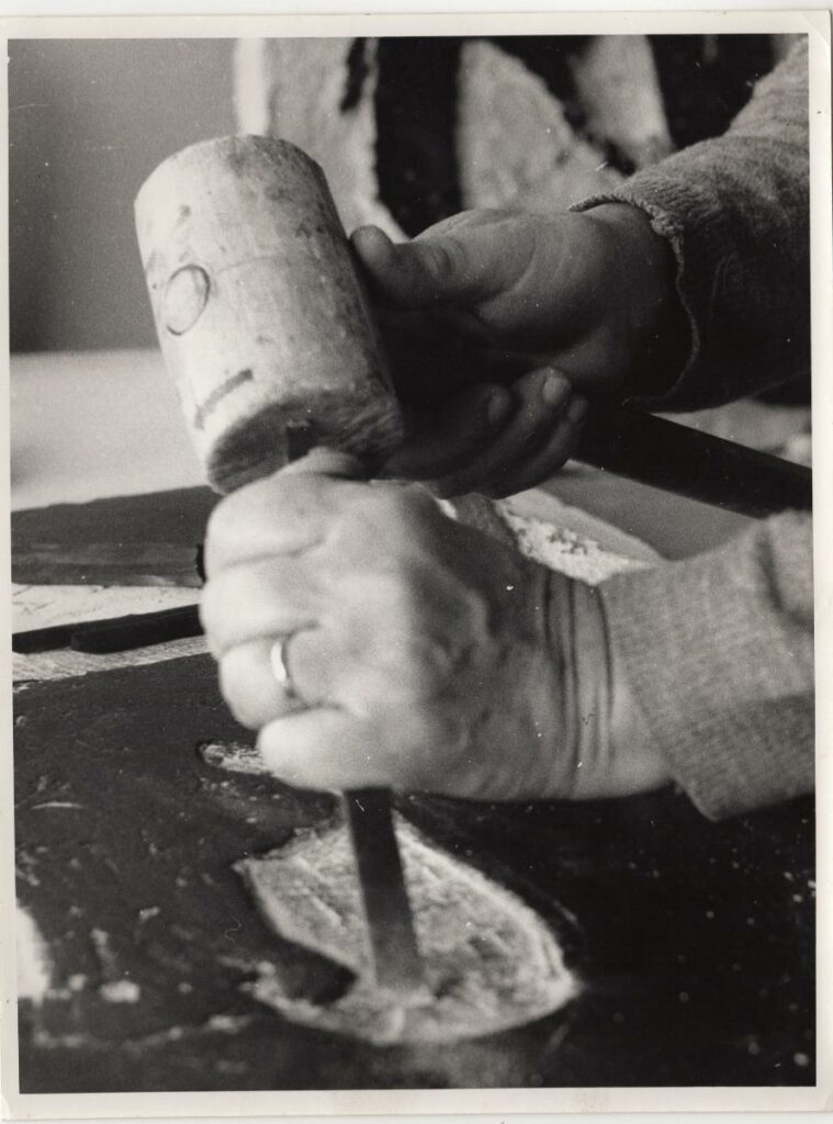 Black-and-white printed photograph of the hands of engraver Vasso Katraki at work.