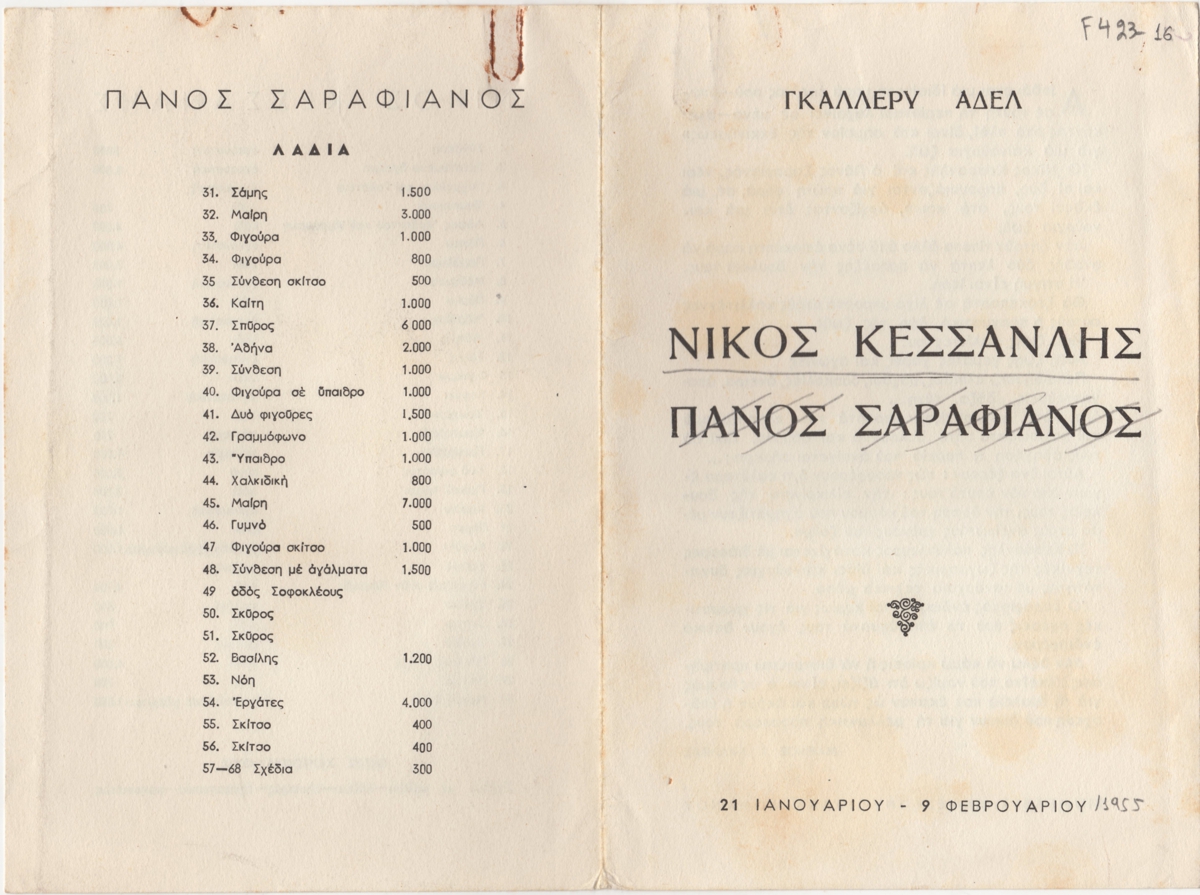 Spiteri-Veropoulou Ioanna (1920 - 2000) ; Touyas Giorgos (1922 - 1994) ; Sotiris Sorogas (1936) ; Moralis Yannis (1916 - 2009) ; Michalis Katzourakis ; Eleni Zongolopoulou (1909 - 1993) ; Simossi Gabriela (1926 - 1999) ; Dimitris Constantinou (1924 - 2010) ; Opy Zouni (1941 - 2008) ; Zongopoulos Giorgos (1903 - 2004) ; (Panagopoulos) Daniel (1924 - 2008) ; Ilias Dekoulakos (1929 - 1998) ; Karas Christos (1930 - 2023) ; Vernadaki Eleni (1933) ; Kampouridis Charis (1950) ; Apergis Antonis (1938 - 2018) ; Panayiotis Gravalos (1933 - 2015) ; Achilleas Droungas (1940) ; Niki Kanagini (1933 - 2008) ; Kostas Karachalios (1923 - 2007) ; Καίτη Αντύπα (1925 - 2006) ; Kessanlis Nikos (1930 - 2004) ; Dimitris Kontos (1931 - 1996) ; Eirini Apergi (1921 - 1994) ; Loucopoulos, Clearchos (1906 - 1995) ; Pastra Nausica (1921 - 2011) ; Κώστας Βαρώτσος (1955)