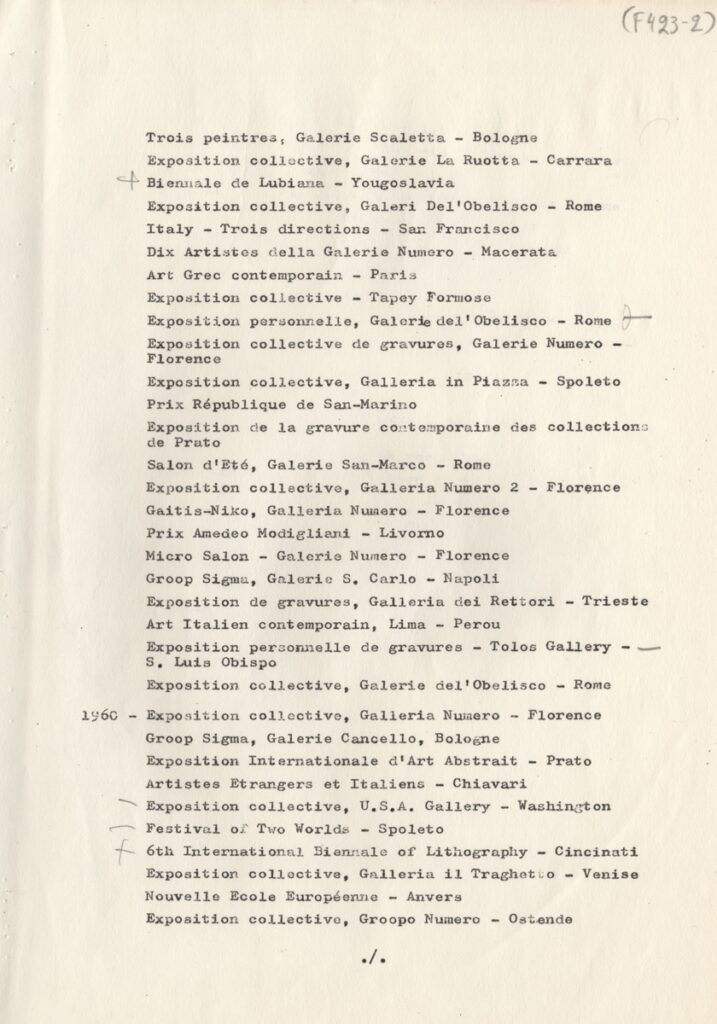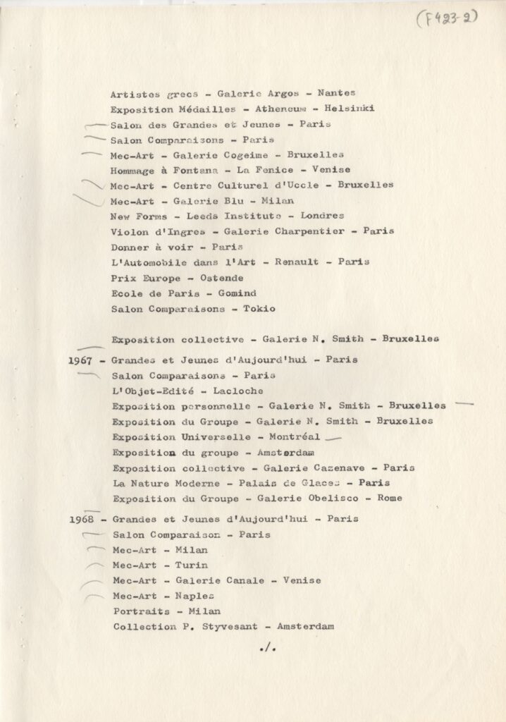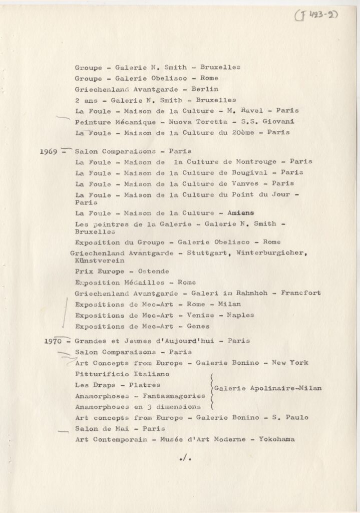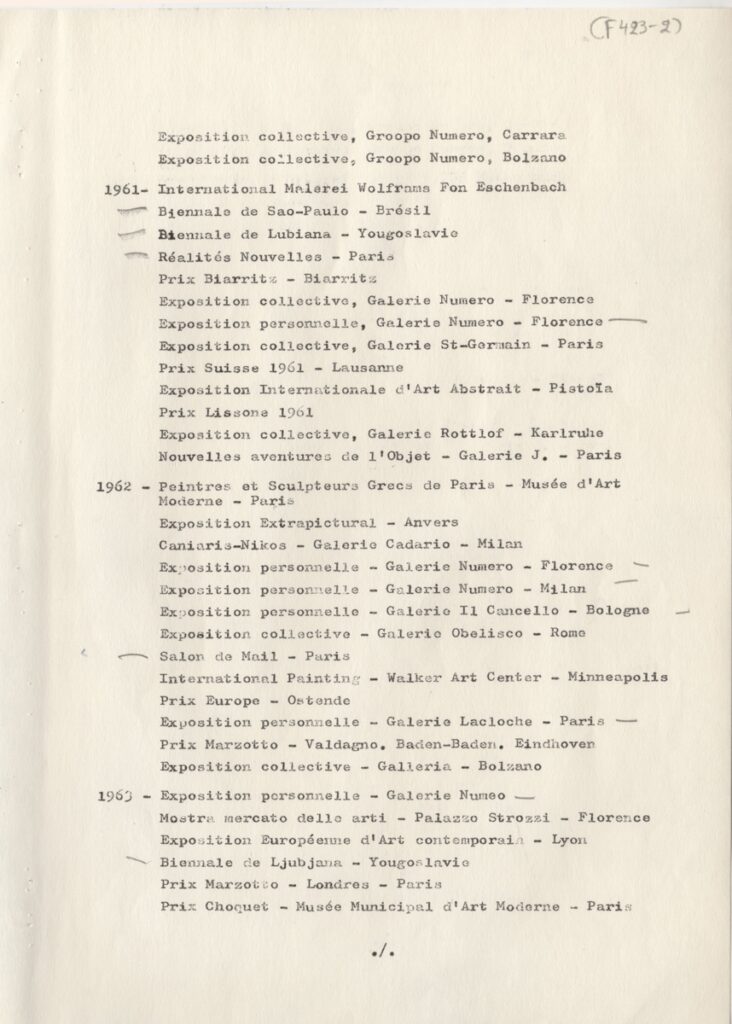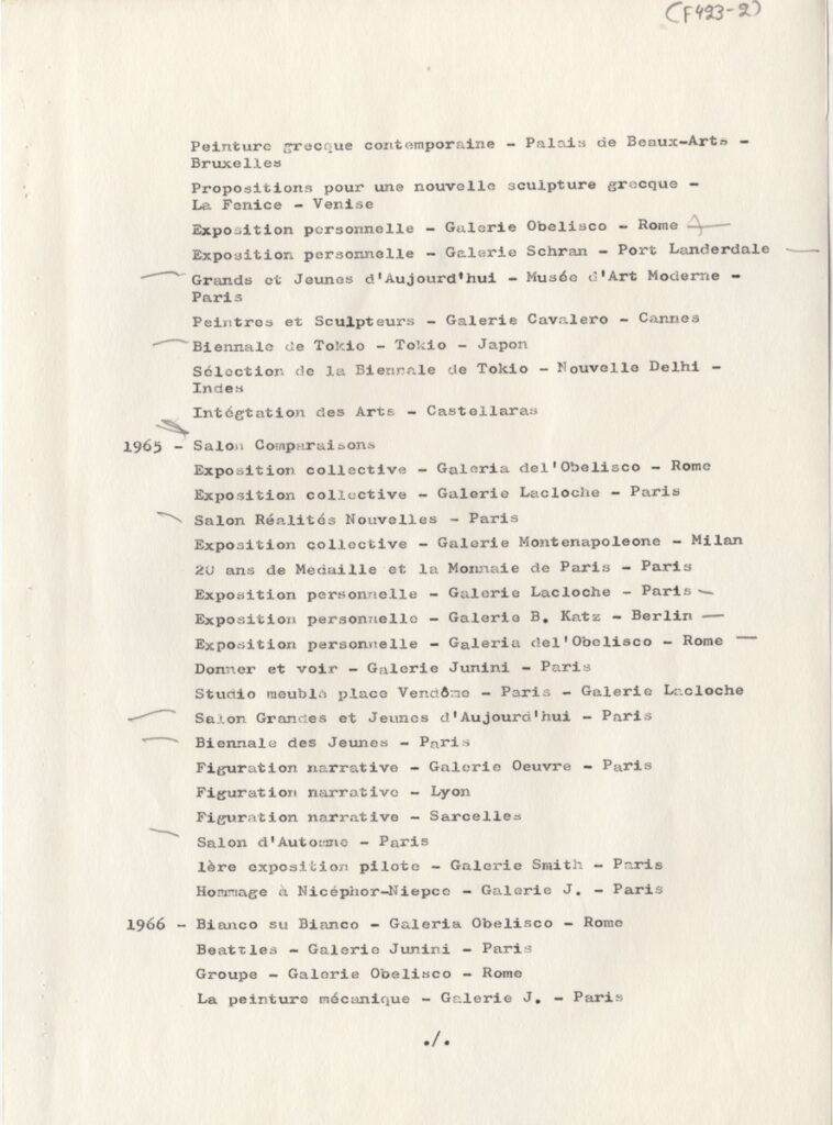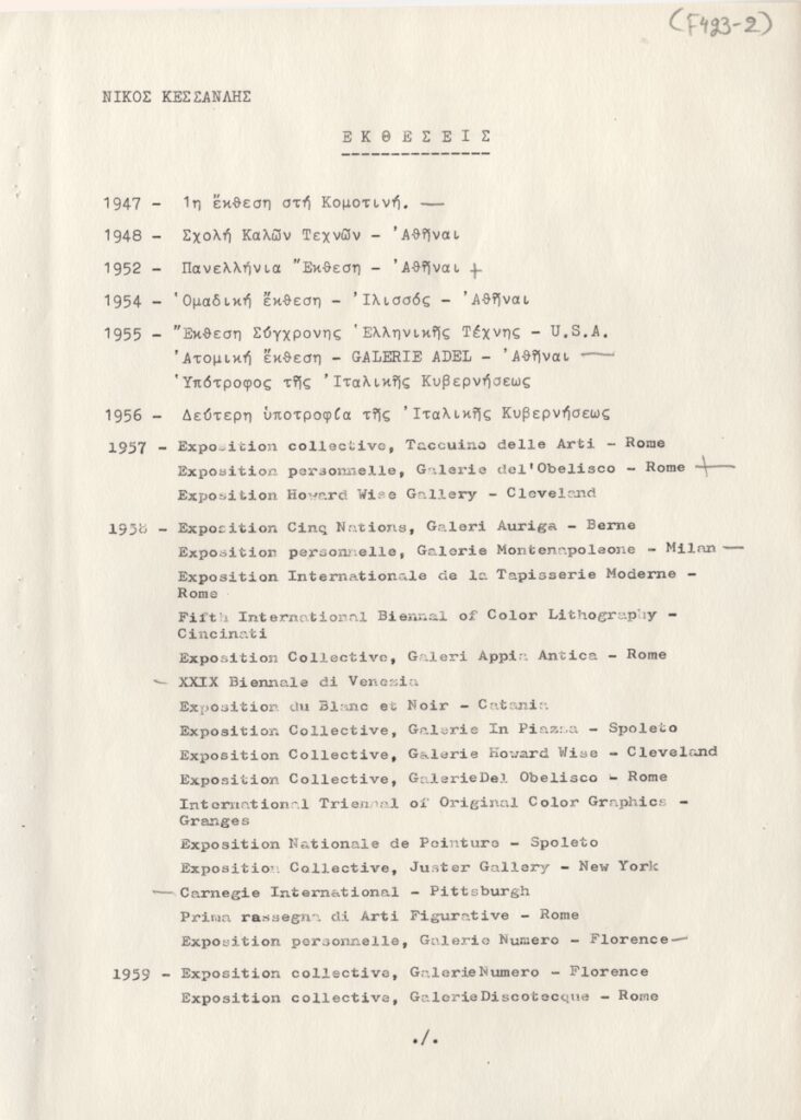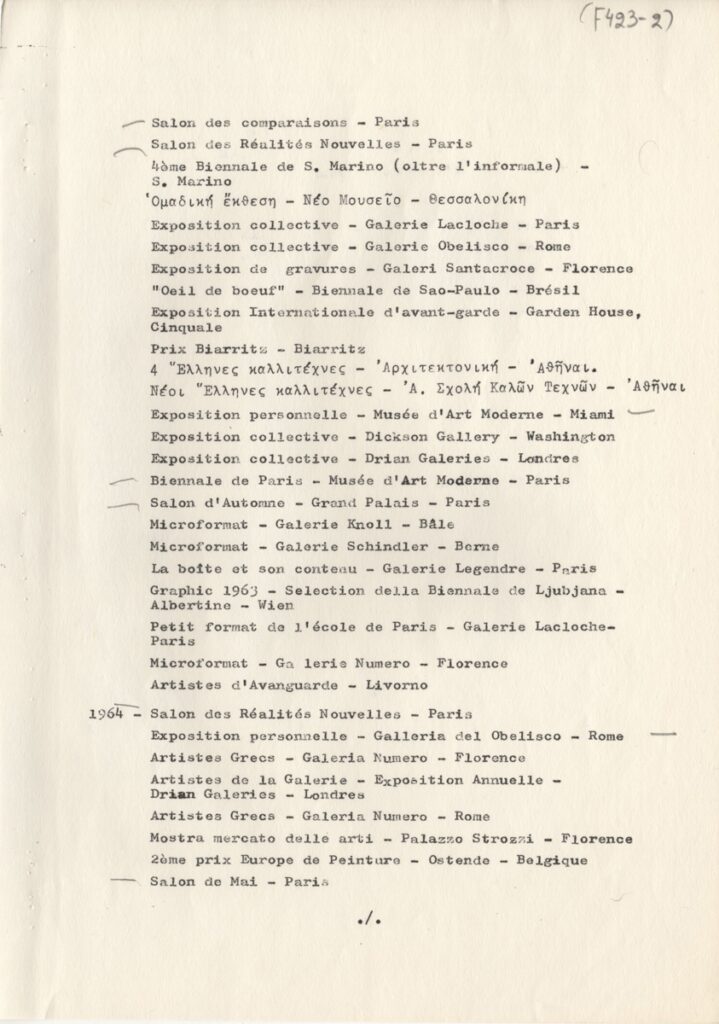 Andreou Kostas (1917 - 2007) ; Fatouros Dimitris (1928 - 2020) ; Spiteri-Veropoulou Ioanna (1920 - 2000) ; Eugène Delacroix (1798 - 1863) ; Touyas Giorgos (1922 - 1994) ; Simossi Gabriela (1926 - 1999) ; Tsoclis Costas (1930) ; Sklavos Yerassimos (1927 - 1967) ; Άγγελος Αγγελόπουλος (1904 - 1995) ; Kontopoulos Alekos (1904 - 1975) ; Mylonas Alex (1923 - 2016) ; Vyzantios Ntikos (1924 - 2007) ; Berto Lardera ; Valsamis Kostas (1908 - 2003) ; Gaitis Yannis (1923 - 1984) ; Le Corbusier (1887 - 1965) ; Georges Mathieu (1921 - 2012) ; Theodoros (Papadimitriou) (1931 - 2018) ; Takis (Vassilakis Panayiotis) (1925 - 2019) ; Victor Vasarely ; Philolaos (Tloupas) (1923 - 2010) ; Kessanlis Nikos (1930 - 2004) ; Kriezi Tita (1930 - 2021) ; Lyberaki Aglaia (1923 - 1985) ; Maltezos Yannis (1915 - 1987) ; Molfesis Iasson (1925 - 2009) ; Paniaras Kostas (1934 - 2014) ; Karras Kostas (1936 - 2012) ; Γιώργος Βαφειάδης