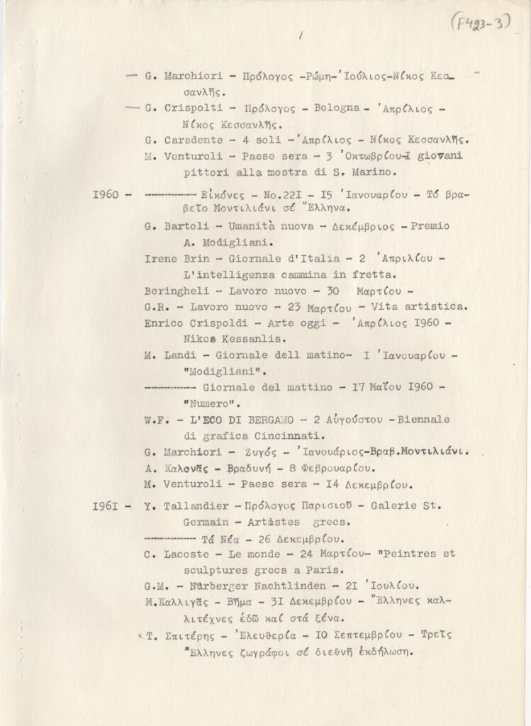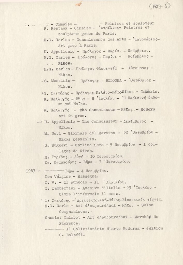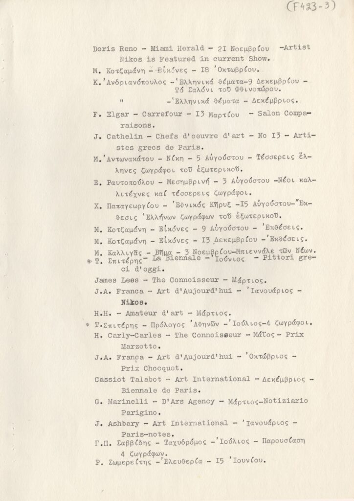 Andreou Kostas (1917 - 2007) ; Fatouros Dimitris (1928 - 2020) ; Spiteri-Veropoulou Ioanna (1920 - 2000) ; Eugène Delacroix (1798 - 1863) ; Touyas Giorgos (1922 - 1994) ; Simossi Gabriela (1926 - 1999) ; Tsoclis Costas (1930) ; Sklavos Yerassimos (1927 - 1967) ; Άγγελος Αγγελόπουλος (1904 - 1995) ; Kontopoulos Alekos (1904 - 1975) ; Mylonas Alex (1923 - 2016) ; Vyzantios Ntikos (1924 - 2007) ; Berto Lardera ; Valsamis Kostas (1908 - 2003) ; Gaitis Yannis (1923 - 1984) ; Le Corbusier (1887 - 1965) ; Georges Mathieu (1921 - 2012) ; Theodoros (Papadimitriou) (1931 - 2018) ; Takis (Vassilakis Panayiotis) (1925 - 2019) ; Victor Vasarely ; Philolaos (Tloupas) (1923 - 2010) ; Kessanlis Nikos (1930 - 2004) ; Kriezi Tita (1930 - 2021) ; Lyberaki Aglaia (1923 - 1985) ; Maltezos Yannis (1915 - 1987) ; Molfesis Iasson (1925 - 2009) ; Paniaras Kostas (1934 - 2014) ; Karras Kostas (1936 - 2012) ; Γιώργος Βαφειάδης