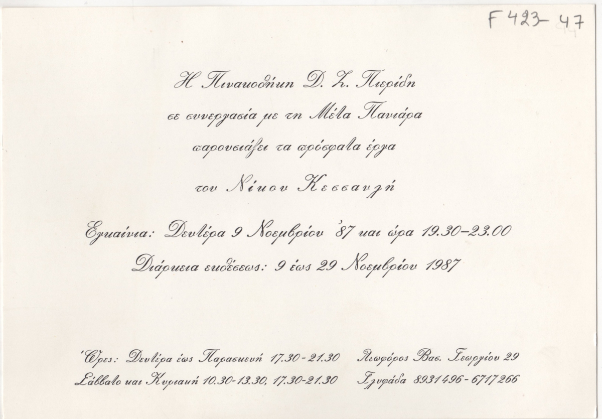 Spiteri-Veropoulou Ioanna (1920 - 2000) ; Touyas Giorgos (1922 - 1994) ; Sotiris Sorogas (1936) ; Moralis Yannis (1916 - 2009) ; Michalis Katzourakis ; Eleni Zongolopoulou (1909 - 1993) ; Simossi Gabriela (1926 - 1999) ; Dimitris Constantinou (1924 - 2010) ; Opy Zouni (1941 - 2008) ; Zongopoulos Giorgos (1903 - 2004) ; (Panagopoulos) Daniel (1924 - 2008) ; Ilias Dekoulakos (1929 - 1998) ; Karas Christos (1930 - 2023) ; Vernadaki Eleni (1933) ; Kampouridis Charis (1950) ; Apergis Antonis (1938 - 2018) ; Panayiotis Gravalos (1933 - 2015) ; Achilleas Droungas (1940) ; Niki Kanagini (1933 - 2008) ; Kostas Karachalios (1923 - 2007) ; Καίτη Αντύπα (1925 - 2006) ; Kessanlis Nikos (1930 - 2004) ; Dimitris Kontos (1931 - 1996) ; Eirini Apergi (1921 - 1994) ; Loucopoulos, Clearchos (1906 - 1995) ; Pastra Nausica (1921 - 2011) ; Κώστας Βαρώτσος (1955)