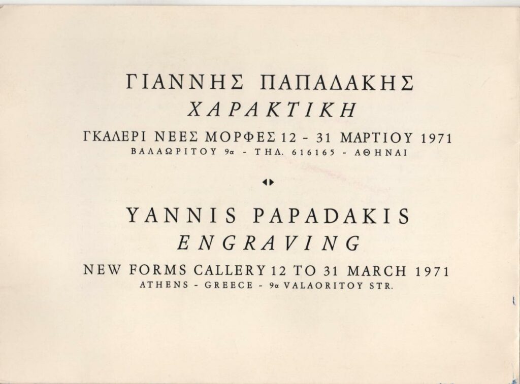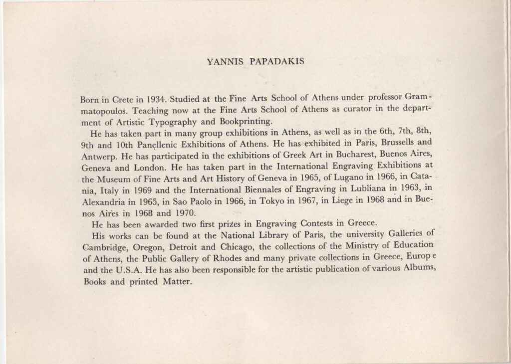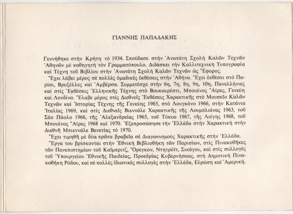 A pamphlet from the solo engraving exhibition of Giannis Papadakis at the “Nees Morfes” Gallery in Athens. It includes a brief biography of the artist.
