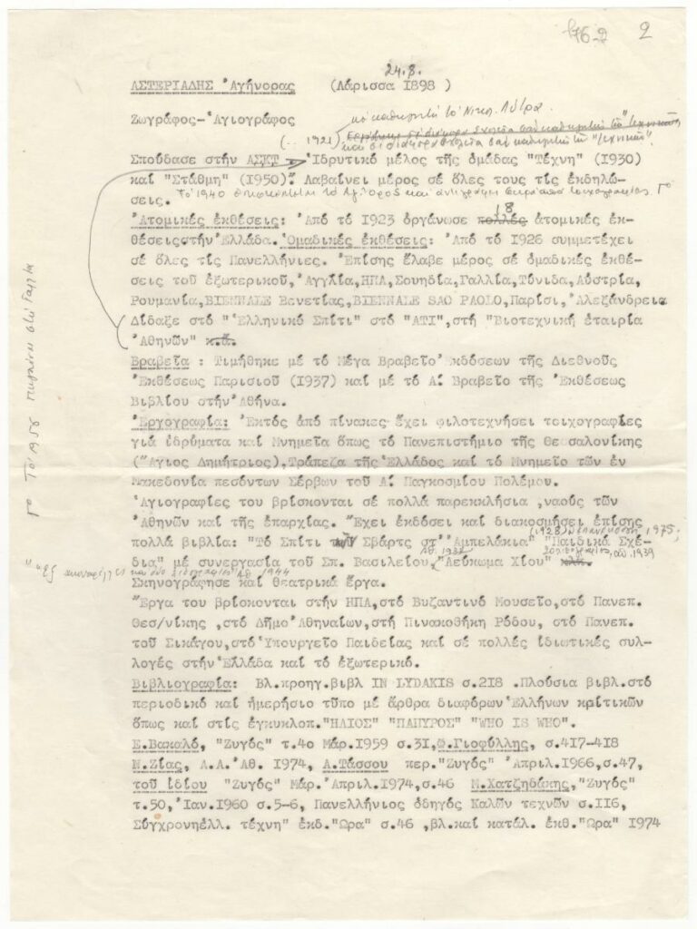 Typewritten text with handwritten corrections. It concerns the biography of the painter Aginor Asteriades