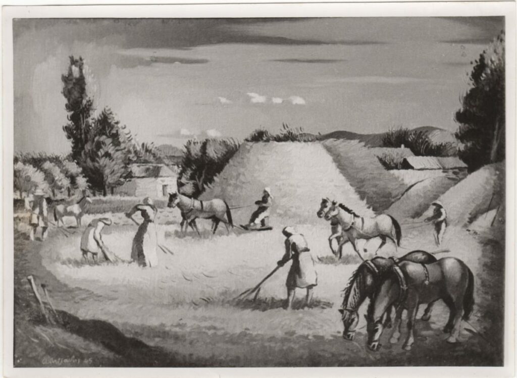 Black-and-white printed photograph of an oil painting by Aginoras Asteriadis. On the reverse, there is a handwritten inscription.