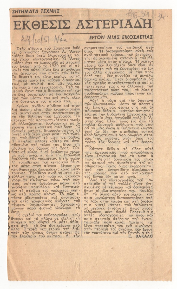 A clipping from the newspaper “Ta Nea”, dated October 27, 1951, featuring an article about the solo exhibition by the painter Aginor Asteriadis in Athens.