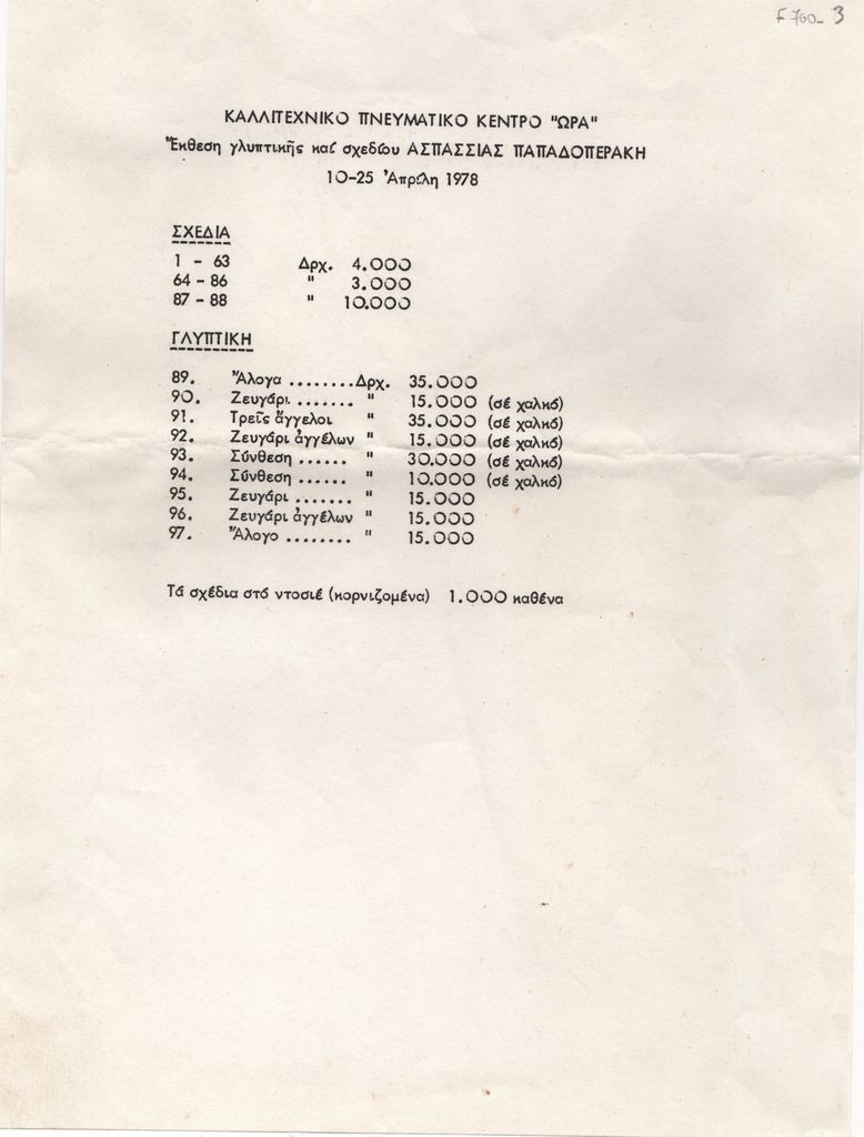Spiteri-Veropoulou Ioanna (1920 - 2000) ; Thymios Panourgias (1931 - 2015) ; Chalepa-Katsatou Katerina (1925 - 2004) ; Χρήστος Γεωργίου ; Argyro Karympaka-Negreponti (1929) ; Ledaki Maria (1932) ; Μάριος Λοβέρδος ; Σωσώ Παπαδοπεράκη ; Christos Riganas (1944) ; Αμαλία Βαμβάκου (1925 - 2014) ; Κώστας Δομπούλας ; Fanakidis Apostolos (1945) ; Αλίκη Χατζή (1923 - 1997) ; Ελένη Αποστολοπούλου (1943) ; Νικόλαος Δογούλης ; Βασιλική Γρουσοπούλου-Μαρκούση (1938) ; Κολέτ Δάρρα (1942) ; Γιώργος Χουλιαράς, εικαστικός (1947)