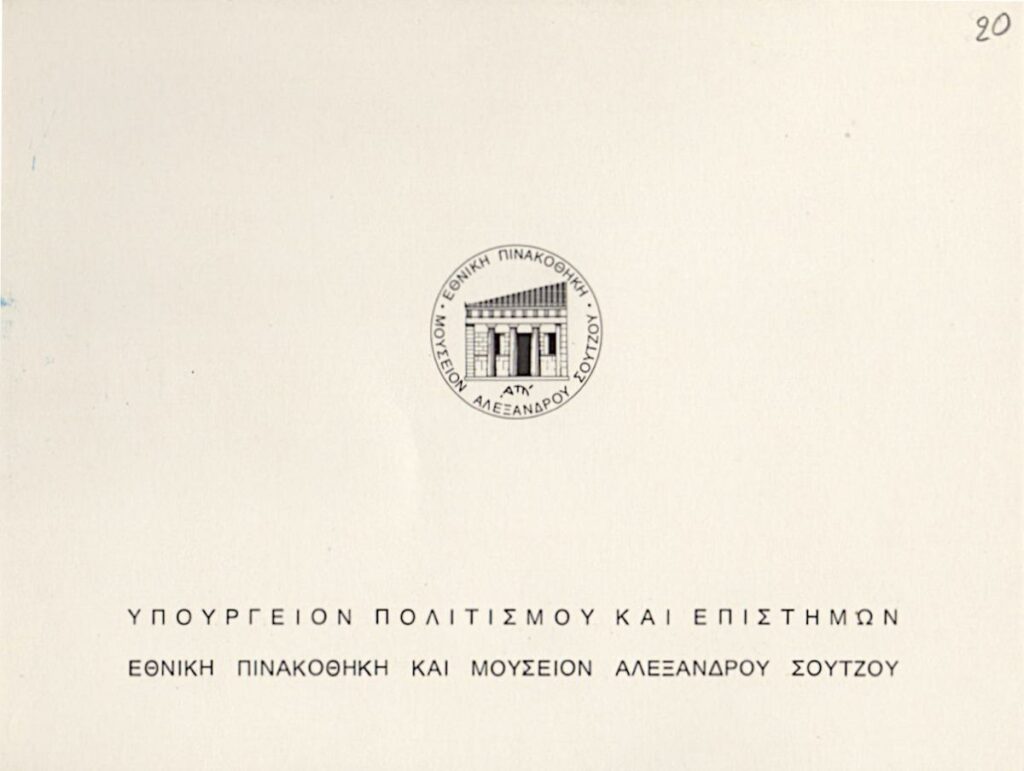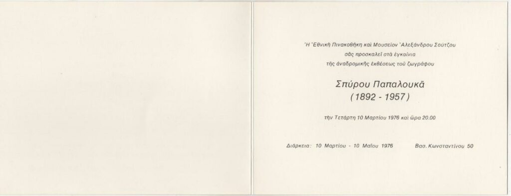 Invitation to the vernissage of a retrospective exhibition of Spyros Papaloukas at the National Gallery in Athens.