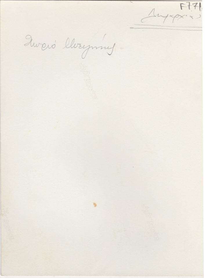Black-and-white printed photograph of an artwork by Spyros Papaloukas. On the reverse, handwritten inscriptions.