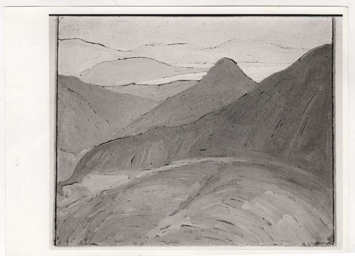 Black-and-white printed photograph of an artwork by Spyros Papaloukas. On the reverse, a handwritten inscription.