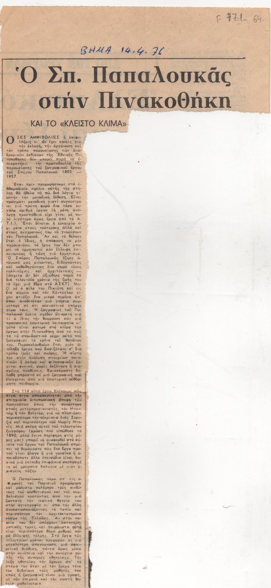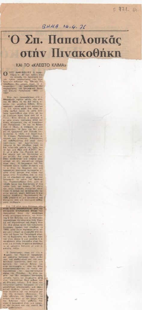 A clipping from the newspaper “I Kathimerini”, dated April 14, 1976, featuring a review of Spyros Papaloukas’s exhibition at the National Gallery, highlighting the significance of the report.