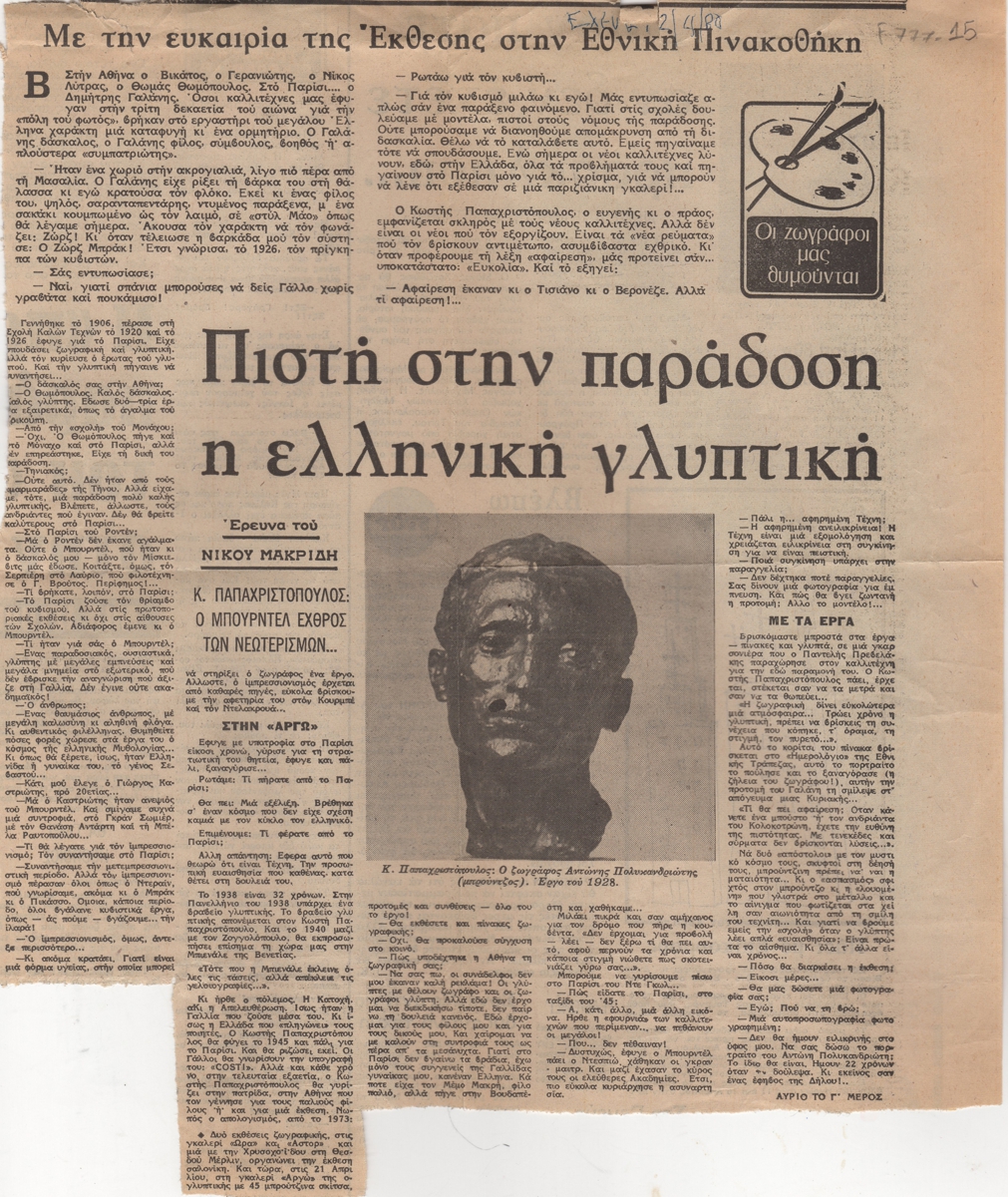 Spiteri-Veropoulou Ioanna (1920 - 2000) ; Michalis Tompros (1889 - 1974) ; Yannoulis Chalepas (1851 - 1938) ; Raftopoulou Bella (1902 - 1992) ; Christos Kapralos (1909 - 1993) ; Sklavos Yerassimos (1927 - 1967) ; Zongopoulos Giorgos (1903 - 2004) ; Thanasis Apartis (1899 - 1972) ; Achilleas Aperghis (1909 - 1986) ; Sochos Antonios (1888 - 1975) ; Mylonas Alex (1923 - 2016) ; Kostas Koulentianos (1918 - 1995) ; Valsamis Kostas (1908 - 2003) ; Avramidis Ioannis (1922 - 2016) ; Theodoros (Papadimitriou) (1931 - 2018) ; Lazaros Lameras (1913 - 1998) ; Philolaos (Tloupas) (1923 - 2010) ; Georgiou Georgios (1916 - ?) ; Apergis Antonis (1938 - 2018) ; Pappas Giannis (1913 - 2005) ; Ikaris Nikolaos (1920 - 1994) ; Loucopoulos, Clearchos (1906 - 1995) ; Lyberaki Aglaia (1923 - 1985) ; Κωστής Παπαχριστόπουλος (1906 - 2004) ; Parandinos Nikolaos (1910 - 1991)