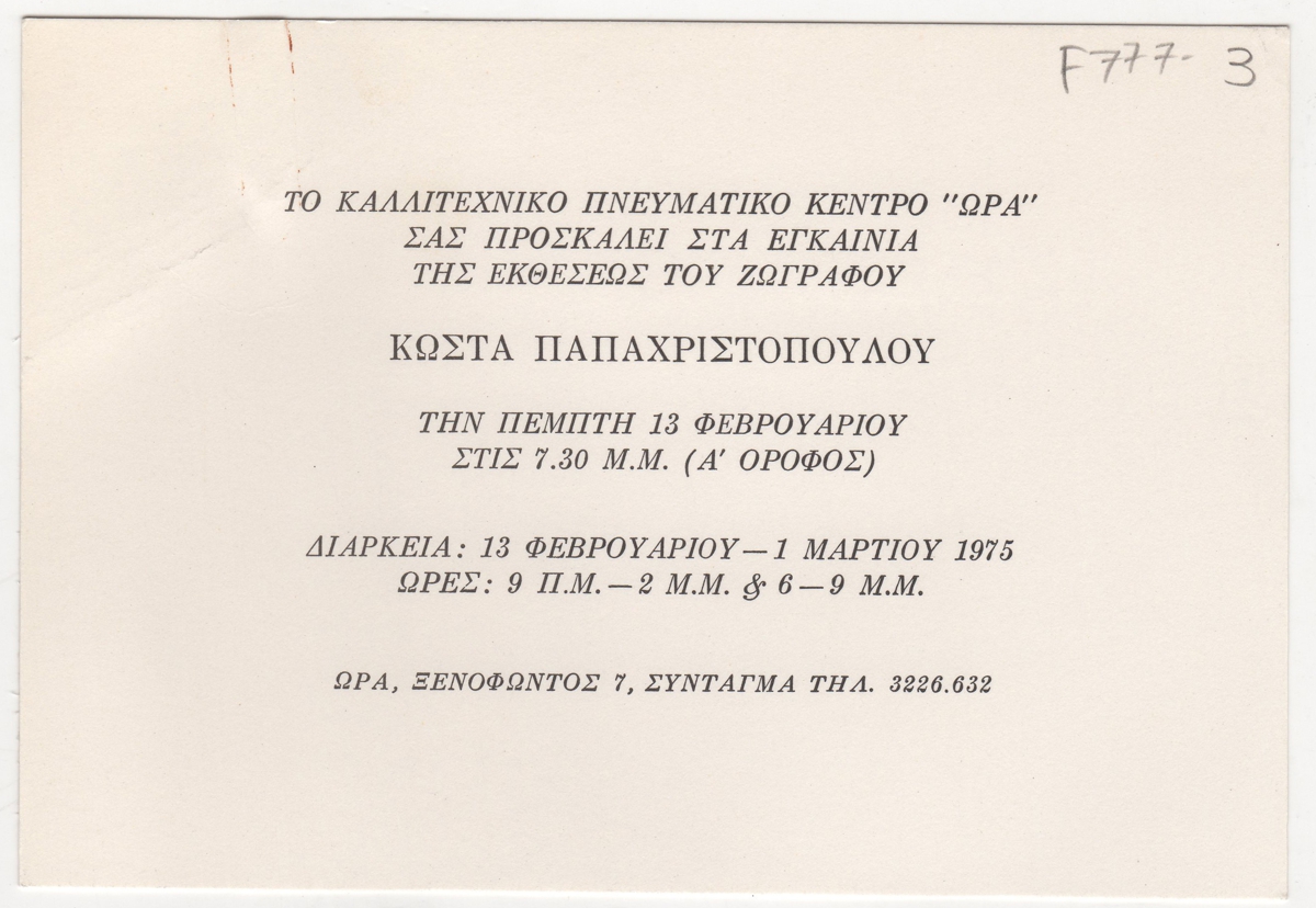 Spiteri-Veropoulou Ioanna (1920 - 2000) ; Michalis Tompros (1889 - 1974) ; Yannoulis Chalepas (1851 - 1938) ; Raftopoulou Bella (1902 - 1992) ; Christos Kapralos (1909 - 1993) ; Sklavos Yerassimos (1927 - 1967) ; Zongopoulos Giorgos (1903 - 2004) ; Thanasis Apartis (1899 - 1972) ; Achilleas Aperghis (1909 - 1986) ; Sochos Antonios (1888 - 1975) ; Mylonas Alex (1923 - 2016) ; Kostas Koulentianos (1918 - 1995) ; Valsamis Kostas (1908 - 2003) ; Avramidis Ioannis (1922 - 2016) ; Theodoros (Papadimitriou) (1931 - 2018) ; Lazaros Lameras (1913 - 1998) ; Philolaos (Tloupas) (1923 - 2010) ; Georgiou Georgios (1916 - ?) ; Apergis Antonis (1938 - 2018) ; Pappas Giannis (1913 - 2005) ; Ikaris Nikolaos (1920 - 1994) ; Loucopoulos, Clearchos (1906 - 1995) ; Lyberaki Aglaia (1923 - 1985) ; Κωστής Παπαχριστόπουλος (1906 - 2004) ; Parandinos Nikolaos (1910 - 1991)