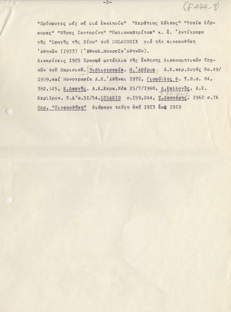 Typewritten text with biographical information about the painter Lykourgos Kogevenas. It includes personal details, solo exhibitions, a list of works, and bibliography.