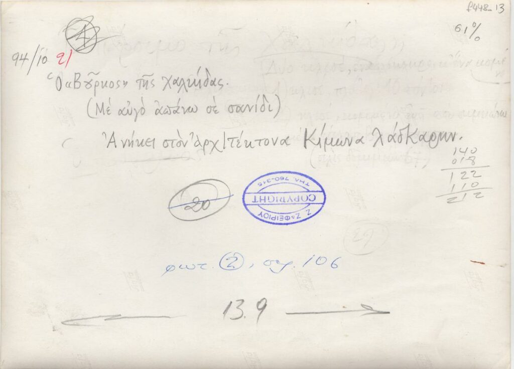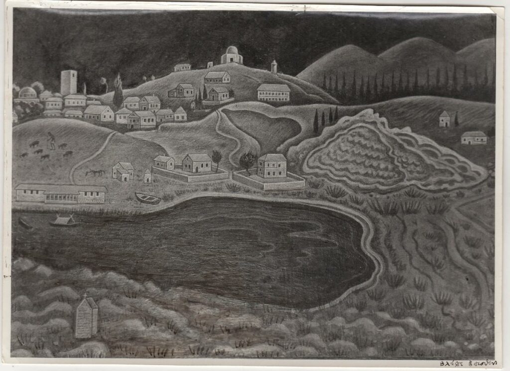 Black-and-white printed photograph of a painting by Fotis Kontoglou. On the reverse handwritten inscripton an stamp of the photographer Zafeiris Zafeiriou.