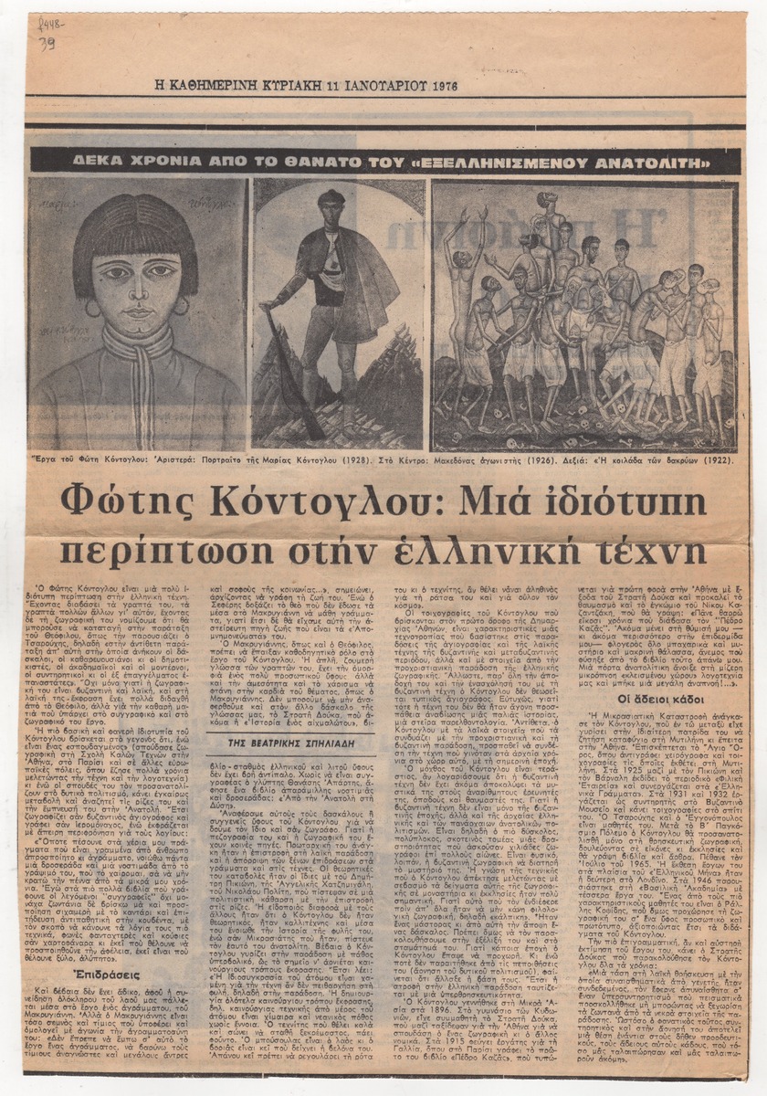 A clipping from the newspaper “I Kathimerini”, dated January 11, 1976, featuring an article about Fotis Kontoglou and his paintings.