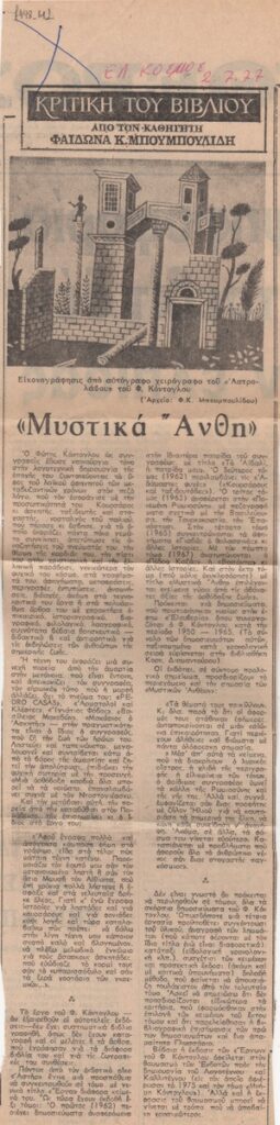 A clipping from the newspaper “Eleftheros Cosmos”, dated July 2, 1977, featuring a review of Fotis Kontoglou’s literary work. The article discusses his publications and provides commentary on his writings and his artwork.