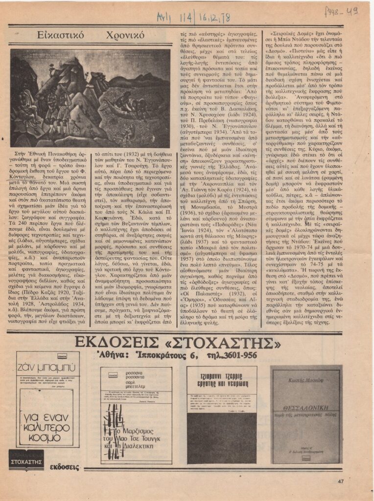 A clipping from the magazine “Anti”, dated December 16, 1978, featuring a review of a retrospective exhibition of Fotis Kontoglou at the National Gallery of Athens.