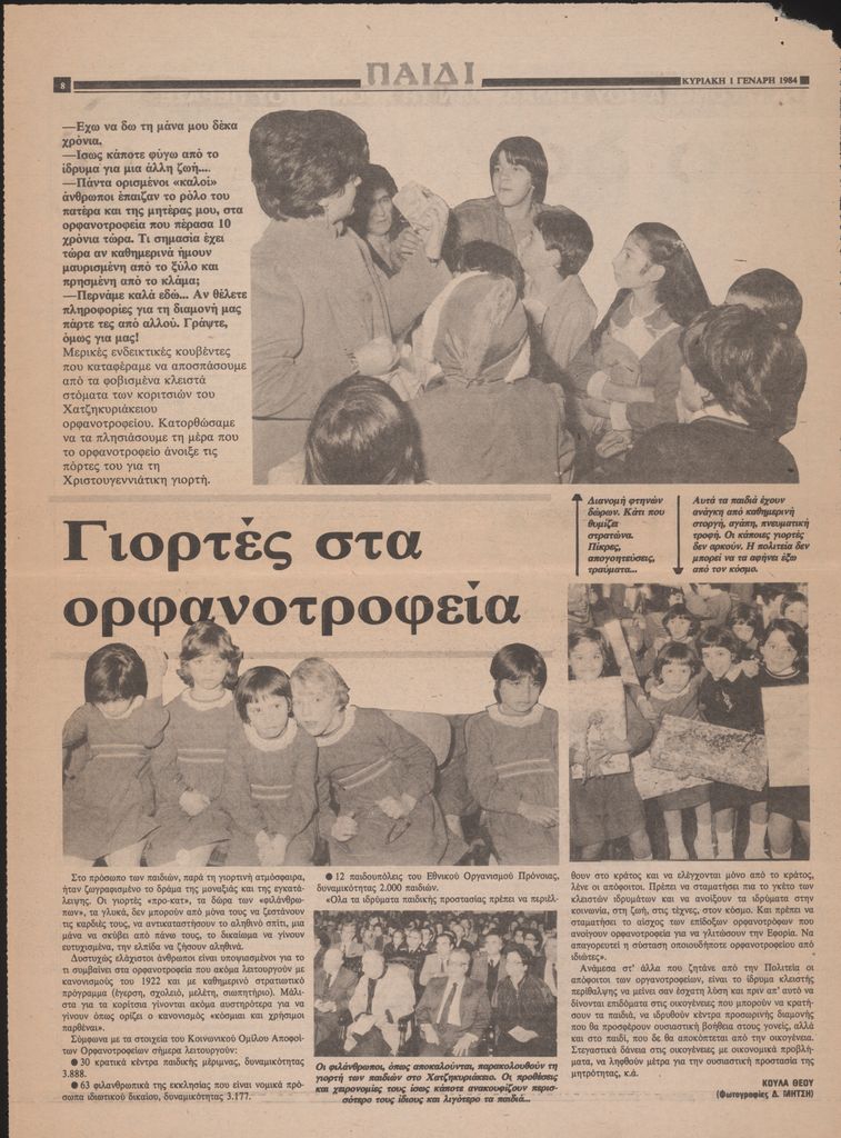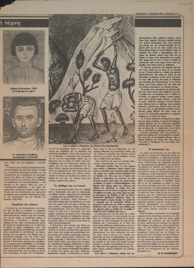 A newspaper clipping, dated January 1, 1984, featuring an article on Fotis Kontoglou and his artistic contributions, published in conjunction with his retrospective exhibition at the Athens Cultural Center.