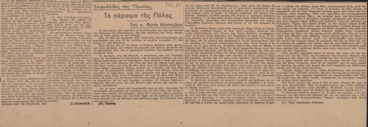 A clipping from the newspaper “Proia”, featuring an article by Fotis Kontoglou.